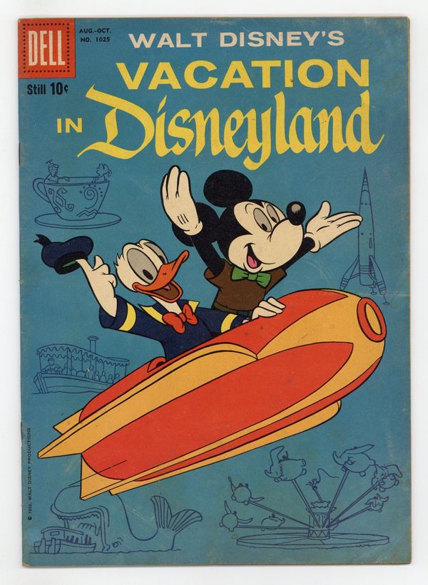 Cover pencils by Tony Strobl. Vacation in Disneyland preface. Mastering the Matterhorn, art by Carl Barks; The ducks climb the Matterhorn, where they find the Beagle Boys and a diamond they've hidden at the top of the mountain. Trail Tycoon starring Grandma Duck and Uncle Scrooge, art by Carl Barks. Disneyland Train Ride activity two-pager. On the Dream Planet, art by Carl Barks; Gyro and Gus find Gus's "dream planet," where the inhabitants are completely lazy. Search the Sea from a Submarine activity page. Travel a Million Miles in Disneyland activity page. 36 pages, full color. Cover price $0.10.