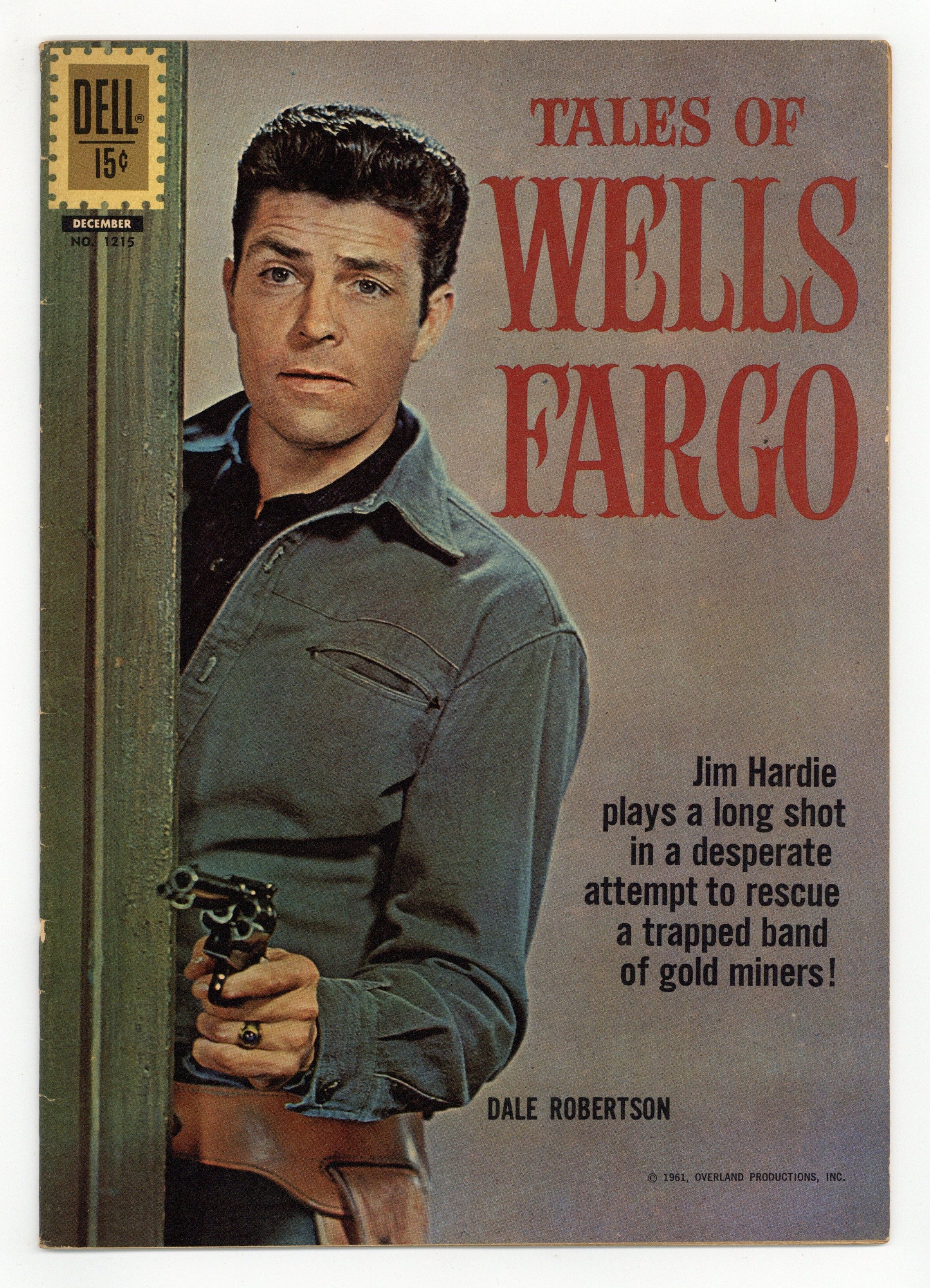 $15.00Indicia title is "TALES OF WELLS FARGO, No. 1215." Photo cover of Jim Hardie (as played by Dale Robertson). Inside from cover photos. Thunder Over Lost Soldier Gulch, script by Gaylord Du Bois, art by Russ Heath; A disguised Hardie uses an old peddler's wagon to get supplies through an outlaw gang's blockade to miners in a remote gulch. Forerunners of Wells Fargo, script by Gaylord Du Bois, inks by Russ Heath; The trials of Major Chorpenning and Captain Woodward as they fulfill a contract to carry mail between Sacramento, Calif., and Salt Lake City, Utah, in the early 1850s. Brand of the Spur, script by Gaylord Du Bois, art by Russ Heath; Hardie trails a bandit who caused a stage to go off the side of a high mountain trail, killing the driver. The Lost Dutchman Mine, script by Gaylord Du Bois, pencils by Gil Kane, inks by Russ Heath; The story of the "Lost Dutchman" mine in Arizona. 36 pages, full color. Cover price $0.15.