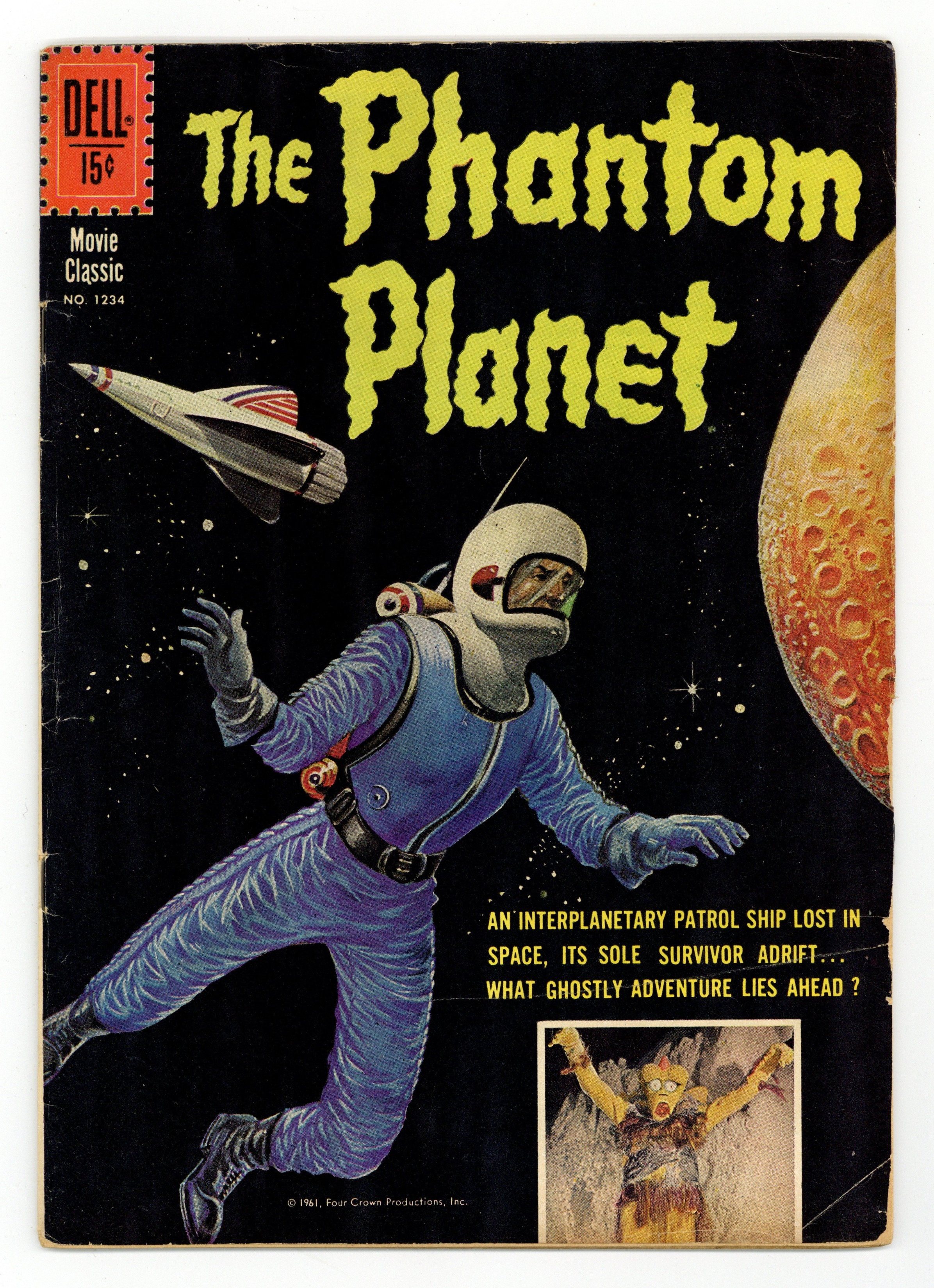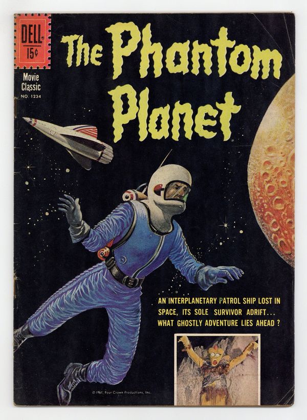Indicia title is "THE PHANTOM PLANET, No. 1234." Adapted from the 1961 movie "The Phantom Planet." Painted cover art with a photo of a Solarite (as played by Richard Kiel). Preview with photos. The Phantom Planet, art by Jack Lehti; An earthman lands on an uncharted asteroid, Rheton, only to find it inhabited by miniature people; The atmosphere shrinks him to their size and he gets involved in a romantic triangle with two women and has to fight a duel; The asteroid is then menaced by alien Solarites, who aim to destroy it. August 1960: The Greatest Month in Space History fact page. Killer Rays in Space; Theories about harmful radiation during space travel. 36 pages, full color. Cover price $0.15.