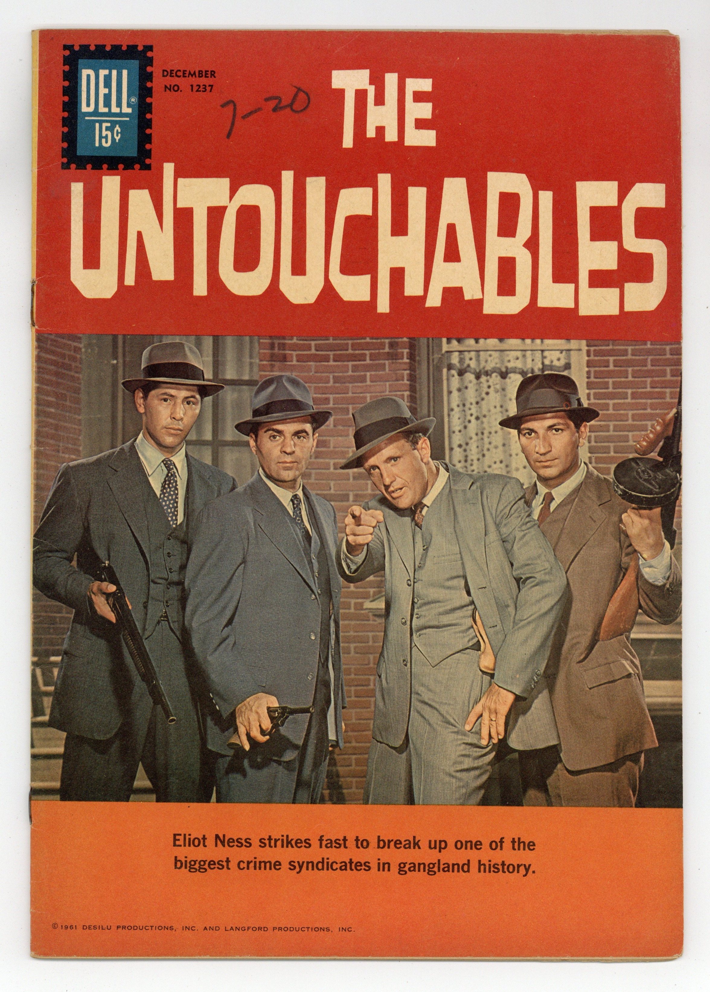 Indicia title is "THE UNTOUCHABLES, No. 1237." Photo cover of Eliot Ness (as played by Robert Stack), Enrico Rossi (Nicholas Georgiade), Lee Hobson (Paul Picerni), and William Youngfellow (Abel Fernández). Preview with photos. The Conspirators; Ness and the Untouchables work to break up a gang's attempt to steal a shipment of cash from a bank transport company. Escape to Nowhere; Ness and the Untouchables track escaped criminals Frankie Moss and Trigger Wills through a Louisiana swamp. No Self-Glory; Facts about the F. B. I. American Agents in Action fact page. All art by Dan Spiegle. 36 pages, full color. Cover price $0.15.