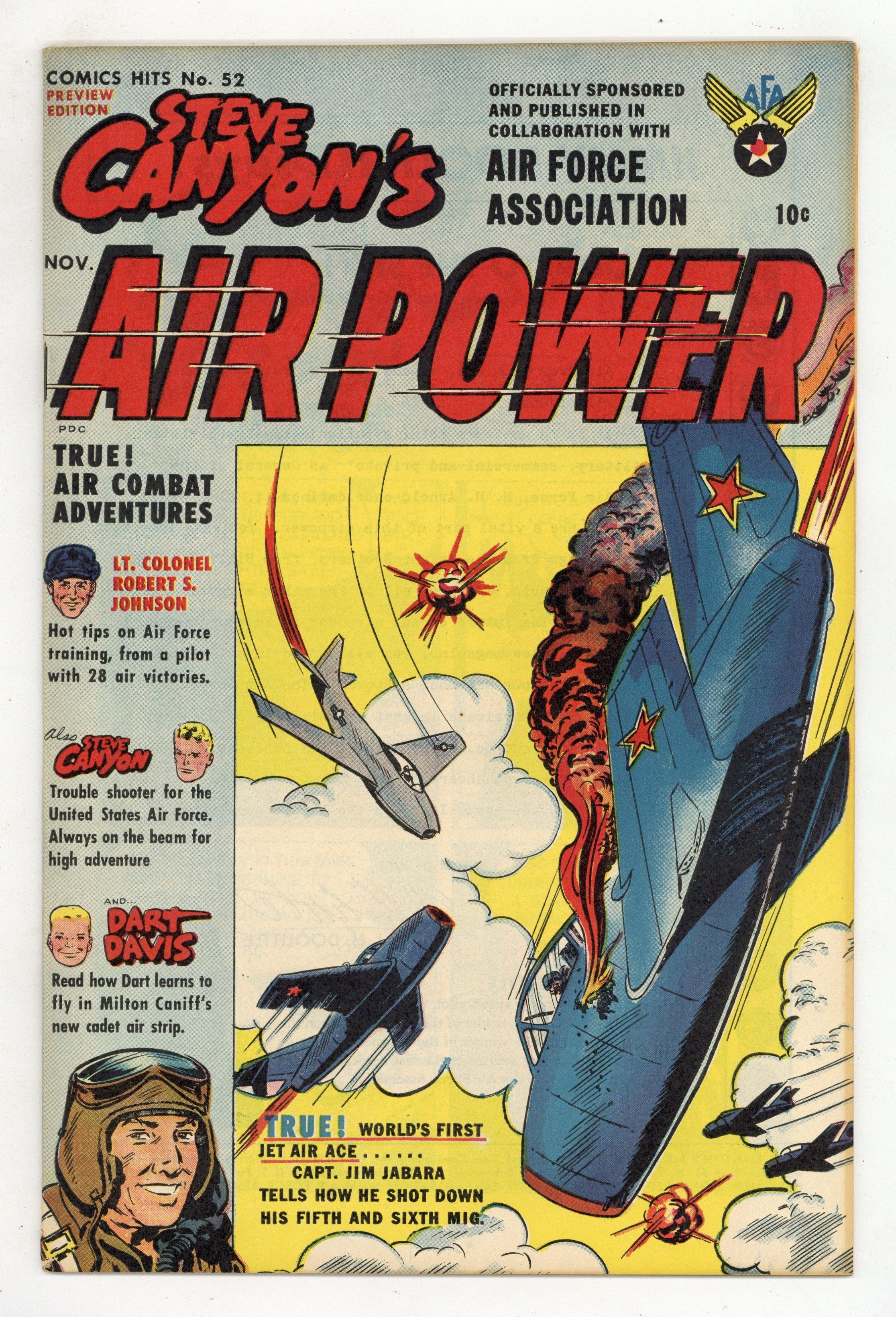 Cover art by Lee Elias (as Milton Caniff). "Let's Play Nurse," script by Milton Caniff, art by Lee Elias (as Milton Caniff); Steve and O'Hooley go undercover to stop the Red Star Underground from attacking the nurses on the base. "Dart Davis," script and art by Milton Caniff; Dart goes to the airport to take flying lessons; While there, he witnesses a crash. "An Up to the Minute Report on Air Force Flight Training" article by Lt. Col. Robert S. Johnson, art by Lee Elias (as Milton Caniff); Article by the President of the A.F.A. "Jet Lingo"; Article on Air Force slang with illustration. "We Fly MIG Alley" text story by Capt. James Jabara, art by Lee Elias (as Milton Caniff); Biographical story with illustrations. "Steve Canyon Takes a 'Four-Foot' Flight," script by Milton Caniff, art by Ray Bailey (as Milton Caniff) and Milton Caniff (touchups); The crew has complications transporting an Asian ambassador, but comic-relief character Snoogle saves the day. Untitled Dart Davis story, script and art by Milton Caniff; Dart gives a speech at school about patriotism. 36 pgs., full color. Cover price $0.10.