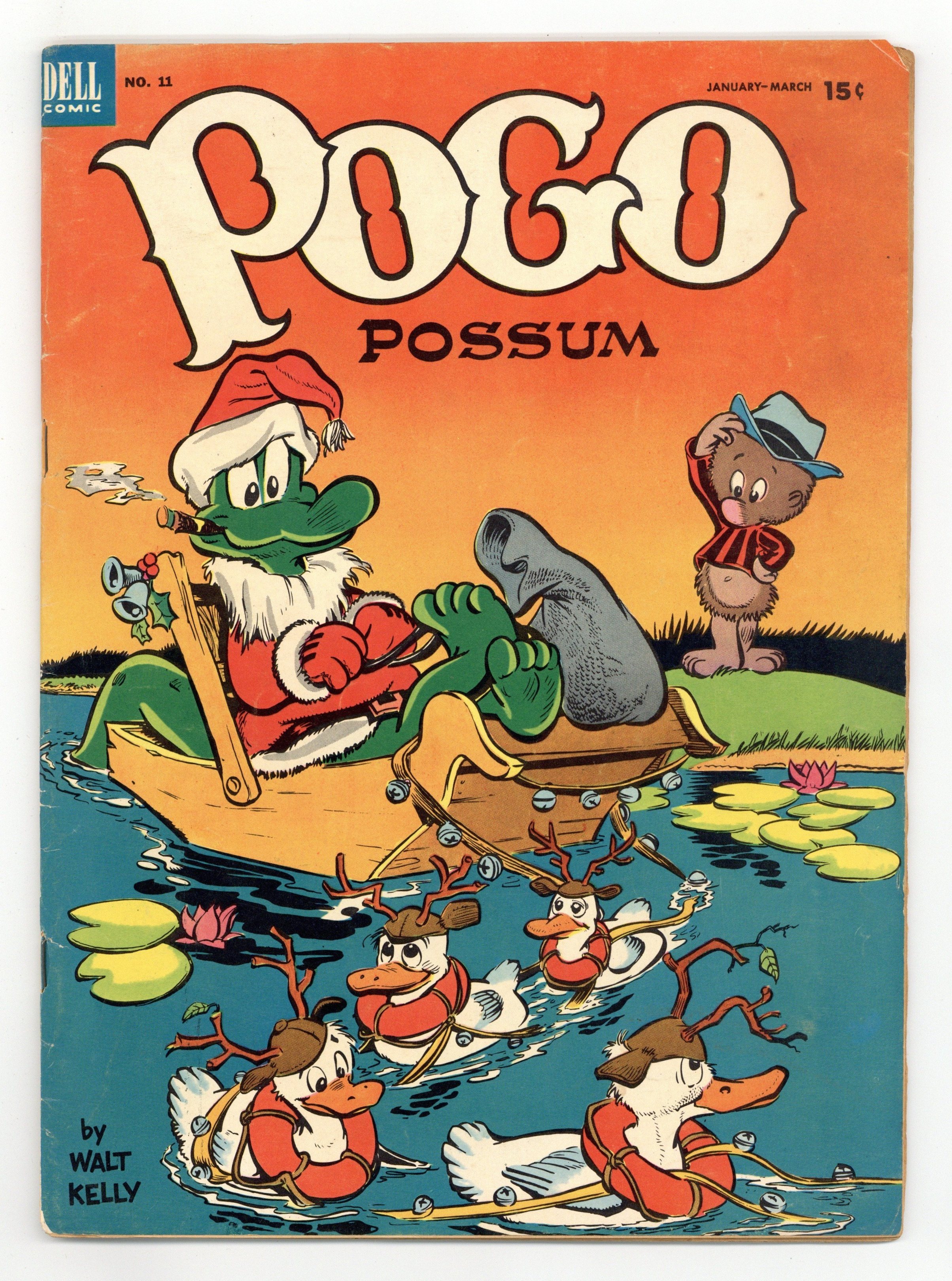 Cover art by Walt Kelly. Scripts and art by Walt Kelly. Untitled one-page story; The frog swallows Alabaster's and Rackety Coon Chile's ping pong ball. "Old Muddle Hupboard"; First Albert, then Pogo tell the story of Old Mother Hubbard. "Hearts of Oak and Heads to Match"; A lifeboat drill [quite literally]. "Dog Daze"; It takes but seven persons to put out a cooking fire. "The Ghost Haunters" text story. "Well Done, Rare Old Medium"; Due to several misunderstandings Albert ends up wearing Miz Beaver's lacy underwear. "The Worm's Turn"; The protagonists try to convince a worm to go fishing with them. "The Dragon Tale"; Albert gets stuck in the music professor's bass horn, and is mistaken for an elephant. Untitled one-page story; Porky needs a new nut for his car engine, being the squirrel turning the wheels. Untitled one-page story; Albert tries blowing out the three candles on his birthday cake. 52 pages, full color. Cover price $0.15.