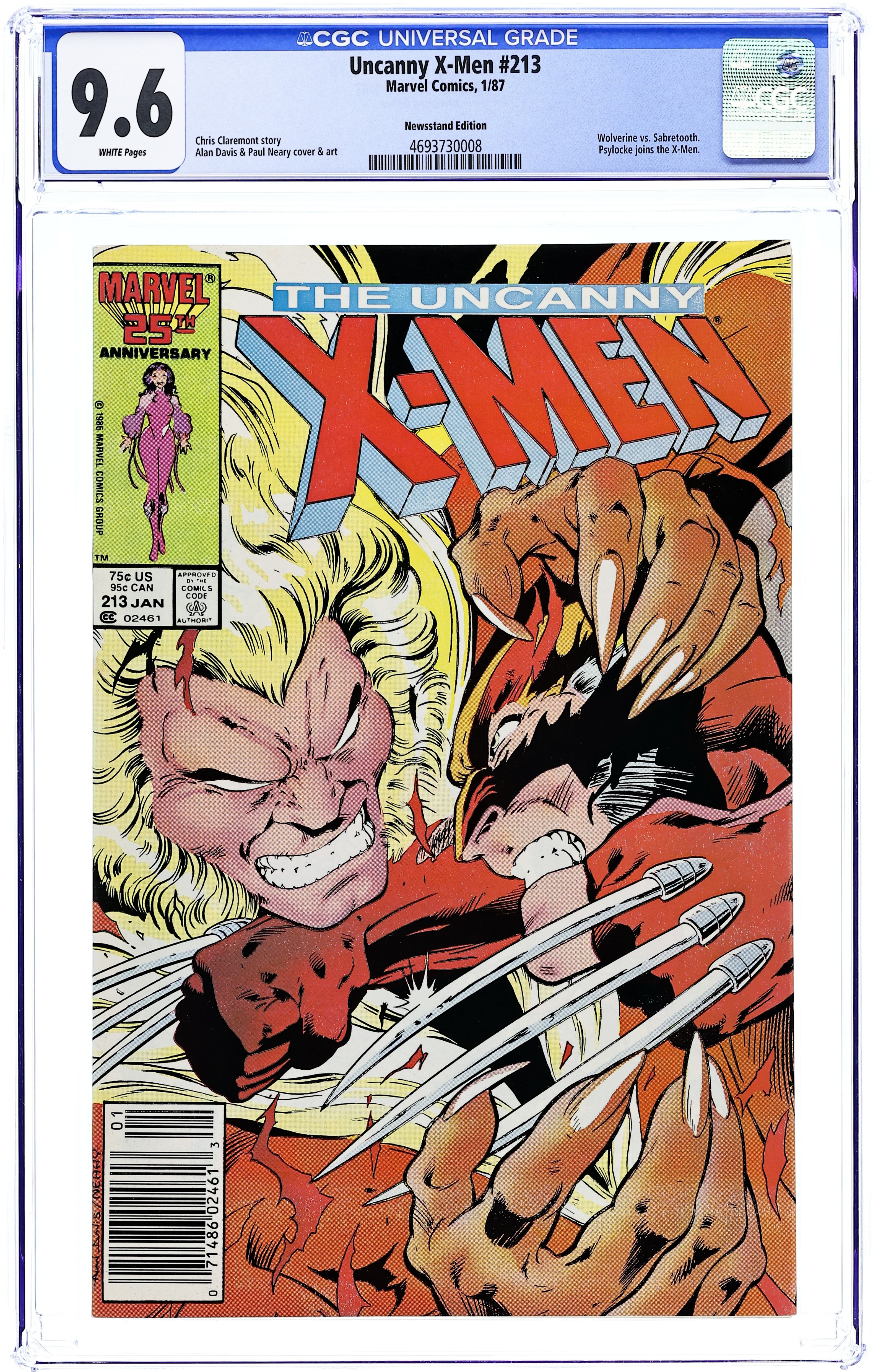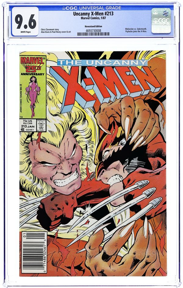 Newsstand Edition. Mutant Massacre tie-in: Wolverine vs. Sabretooth, Round 2: "Psylocke." Story by Chris Claremont. Art by Alan Davis and Paul Neary. This story takes place after the events of Thor (Vol. 1) #374. In order to protect the injured, Psylocke must somehow stall the mutant assassin Sabretooth long enough for the X-Men to return from the Morlock tunnels. What follows is a deadly game of cat and mouse. That will have you on the edge of your seat until the last page is turned. 36 pages, FC Cover price $0.75.
