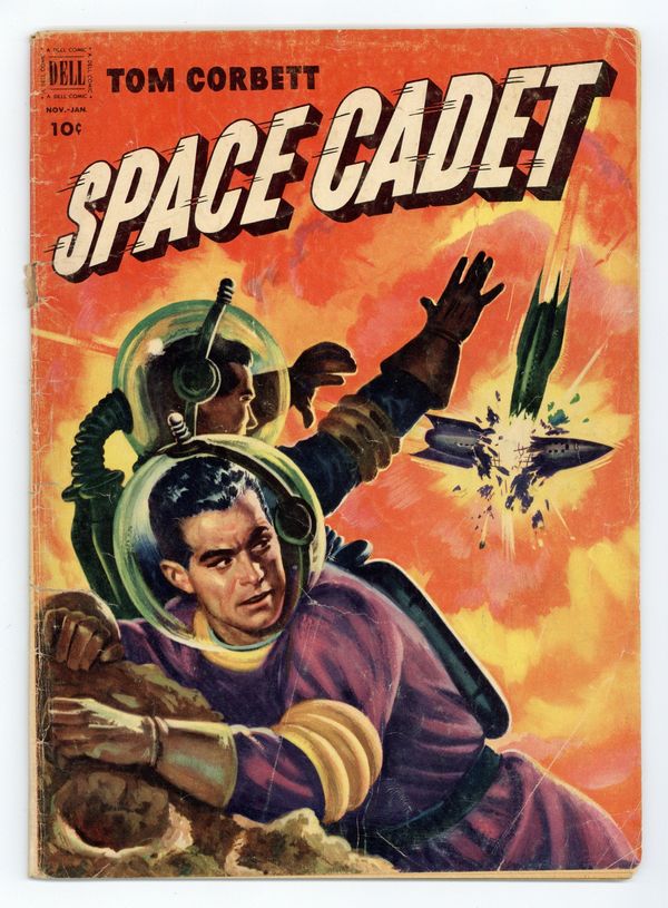 Painted cover by Al McWilliams. Stories by Paul S. Newman and others. Art by Jack Lehti and others. Adventures in space, based on the pioneering sci-fi TV show Tom Corbett, Space Cadet. The Tom Corbett issues of Four Color (1942-1962 Dell 2nd Series) count as the first three issues, in Dell's reckoning. Tom and the other cadets search for the missing Professor Thornton. What they find is a Martian picpup (which can create illusions) and the people of Bor Borito. Plus a photo still from the TV series. Terrific painted cover by Al McWilliams. 32 pages, Full Color. Cover price $0.10.