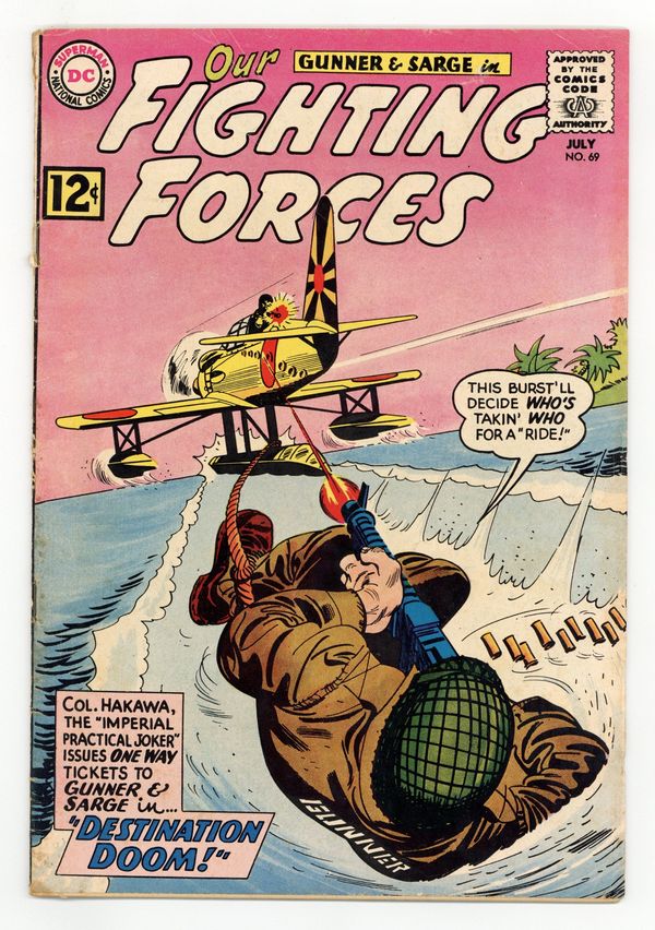 Gunner and Sarge in "Destination Doom!" Also "Last Chance For a Frogman," and "T.N.T. Mailman" (art by Joe Kubert). Superman stars in a one-page public service announcement, "Be a Good Citizen!" 36 Pages, Full Color. Cover price $0.12.