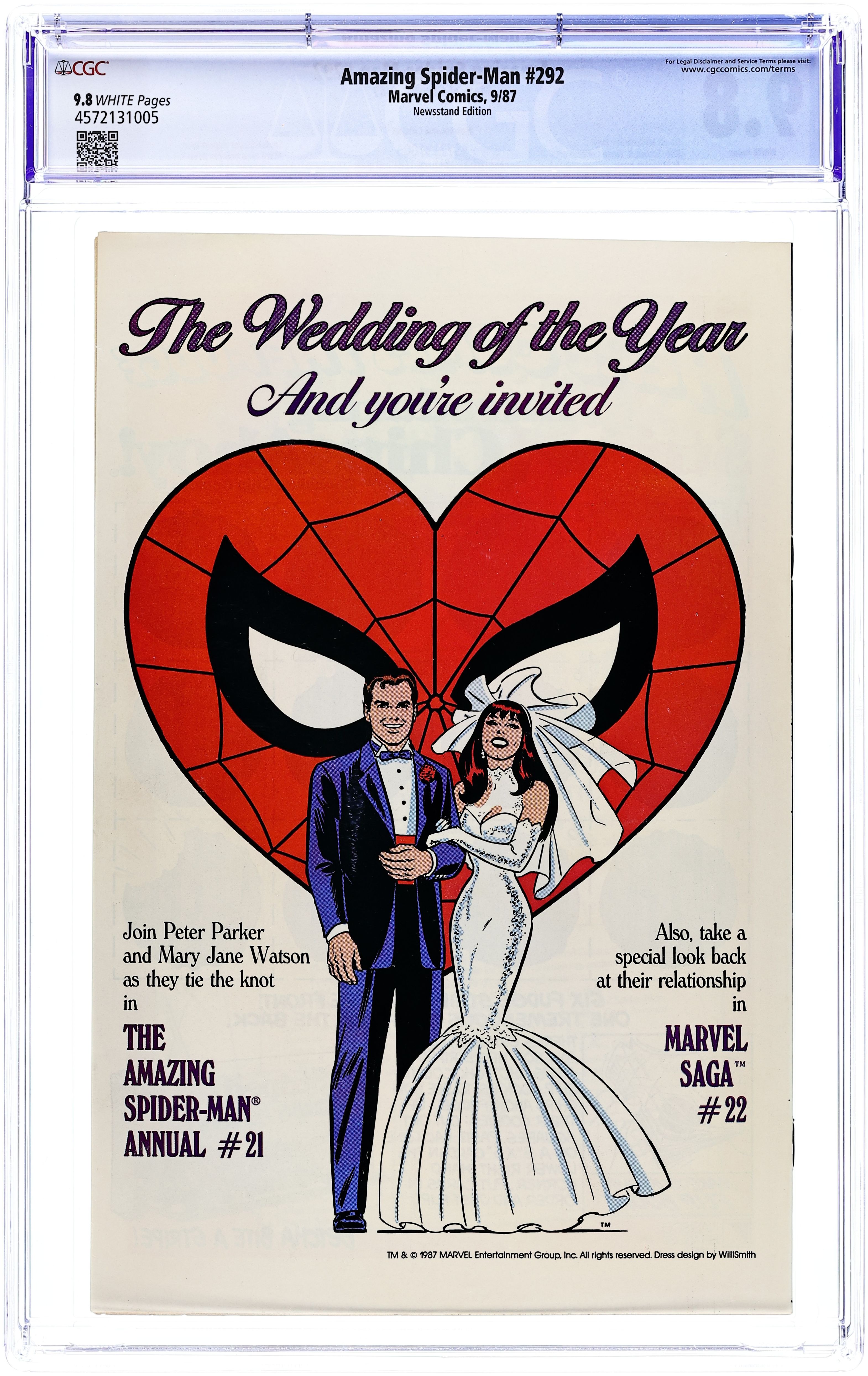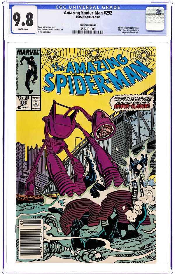 Newsstand Edition. "Growing Pains!" Part 3 of 3. Script by David Michelinie. Pencils by Alex Saviuk. Inks by Vince Colletta. Cover by Al Milgrom. At the confluence of the Allegheny, Monongahela, and Ohio rivers; the Amazing Spider-Man faces a double crisis! Alistar Smythe's spider-slayer roams the streets of Pittsburgh, while Mary Jane's crooked father attempts to steal a famous manuscript! First the wall-crawler and MJ have to smash the spider-slayer! And then turn the tables on the corrupt Philip Watson! If Peter and Mary Jane can score a double victory, they might just live happily ever after...together! Story continues in the landmark Amazing Spider-Man Annual 21. (Notes: In the final panel, Mary Jane accepts Peter's marriage proposal. Alistair Smythe returns in Amazing Spider-Man 368. The back cover features a full-page ad and cover preview of Amazing Spider-Man Annual 21 by John Romita Sr.) 36 pages. Cover price $0.75.