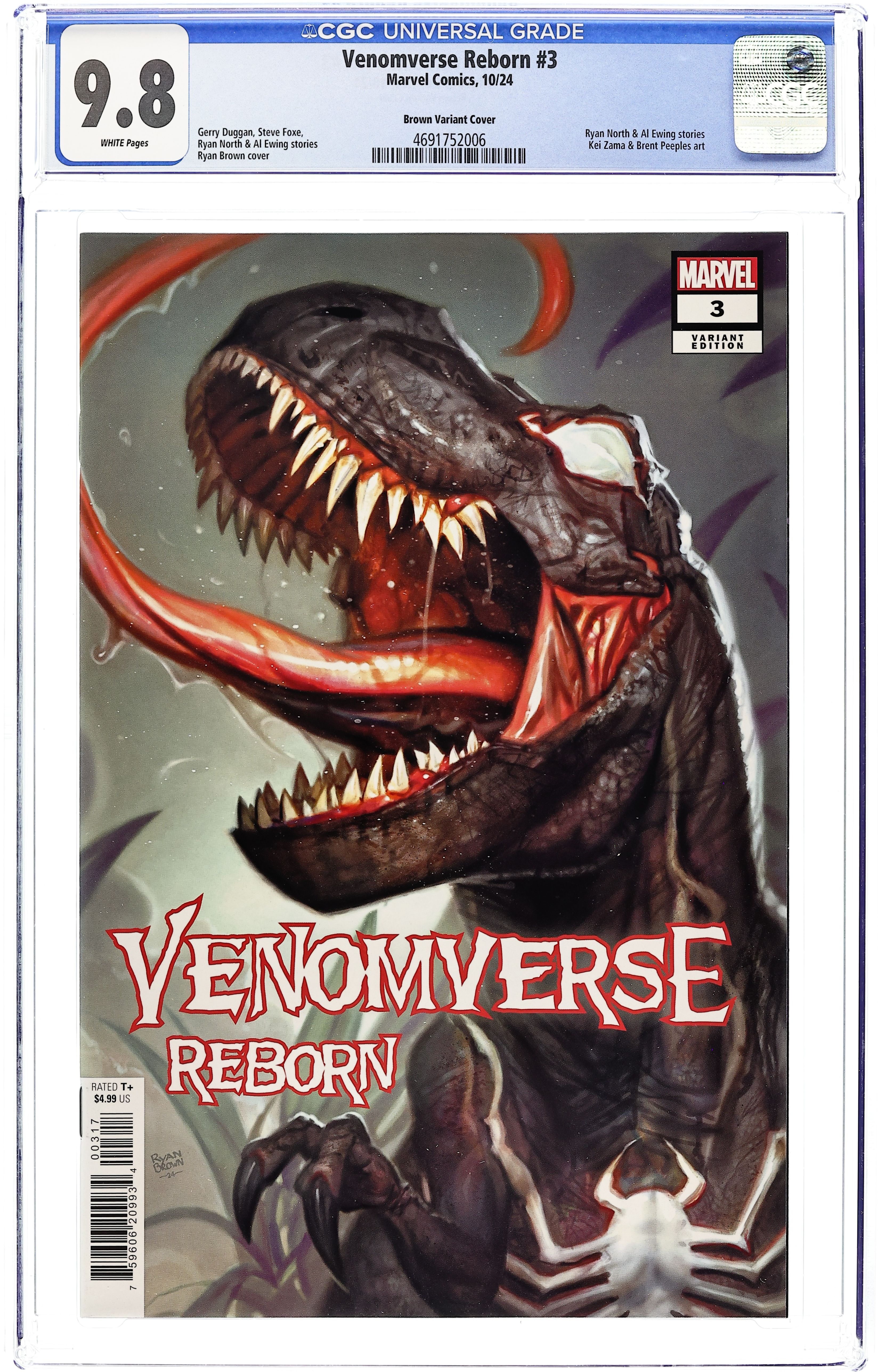 Limited 1 for 25 Retailer Incentive Variant Cover. Written by Gerry Duggan; Steve Foxe, VARIOUS. Art by Kei Zama, VARIOUS. Cover by Ryan Brown. A VENOM FOR EVERY UNIVERSE! Our journey of Venomous beings across the Multiverse continues with darkness, light and everything in between! First up, Gerry Duggan brings us the tragic tale of Venom's biggest fan! Then Ryan North & Matthew Waite bring us a surprising tail of Venom Rex! Next up is the reveal of the all-new symbiote who fights Spider-Verse breakout star, Web-Weaver, from Steve Foxe & Kei Zama! And it's all wrapped up in a special black suit spun by Al Ewing & Danilo S. Beyruth! 32 pages, full color. Rated T+ Cover price $4.99.