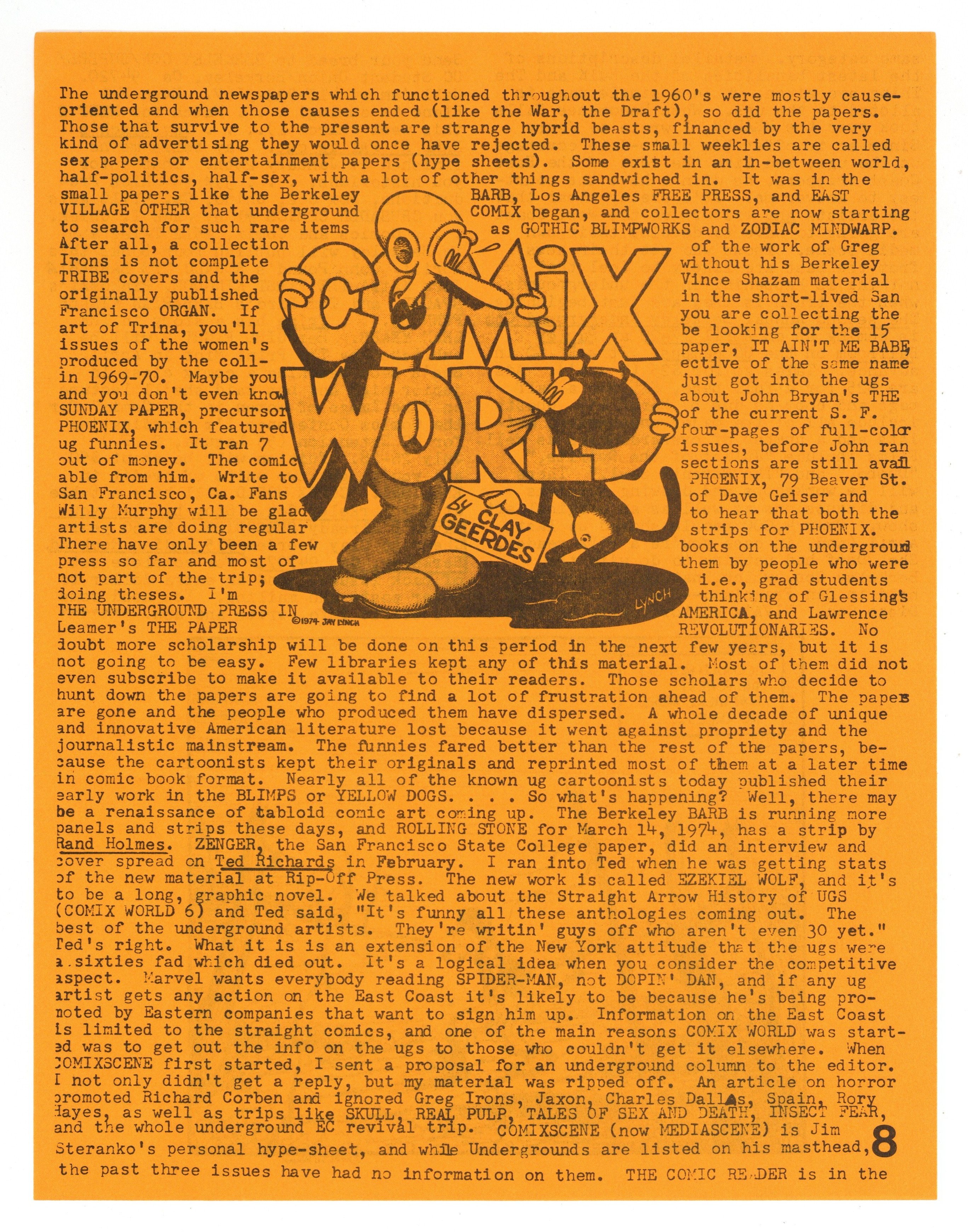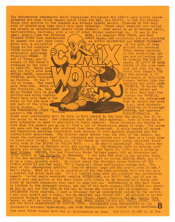 Tags: UndergroundPublished Oct 1973 by Clay Geerdes.$24.50October 1973. Newsletter by Clay Geerdes. Contains news of comix, artists of interest, and a general review of what was happening in the underground market. 8 1/2-in. x 11-in., 2 pages, black and white.