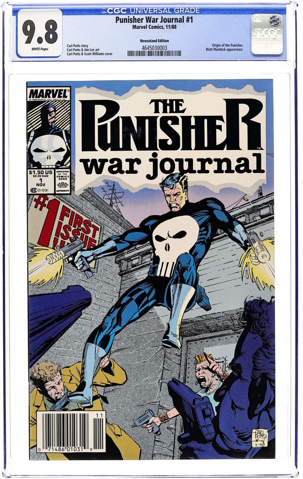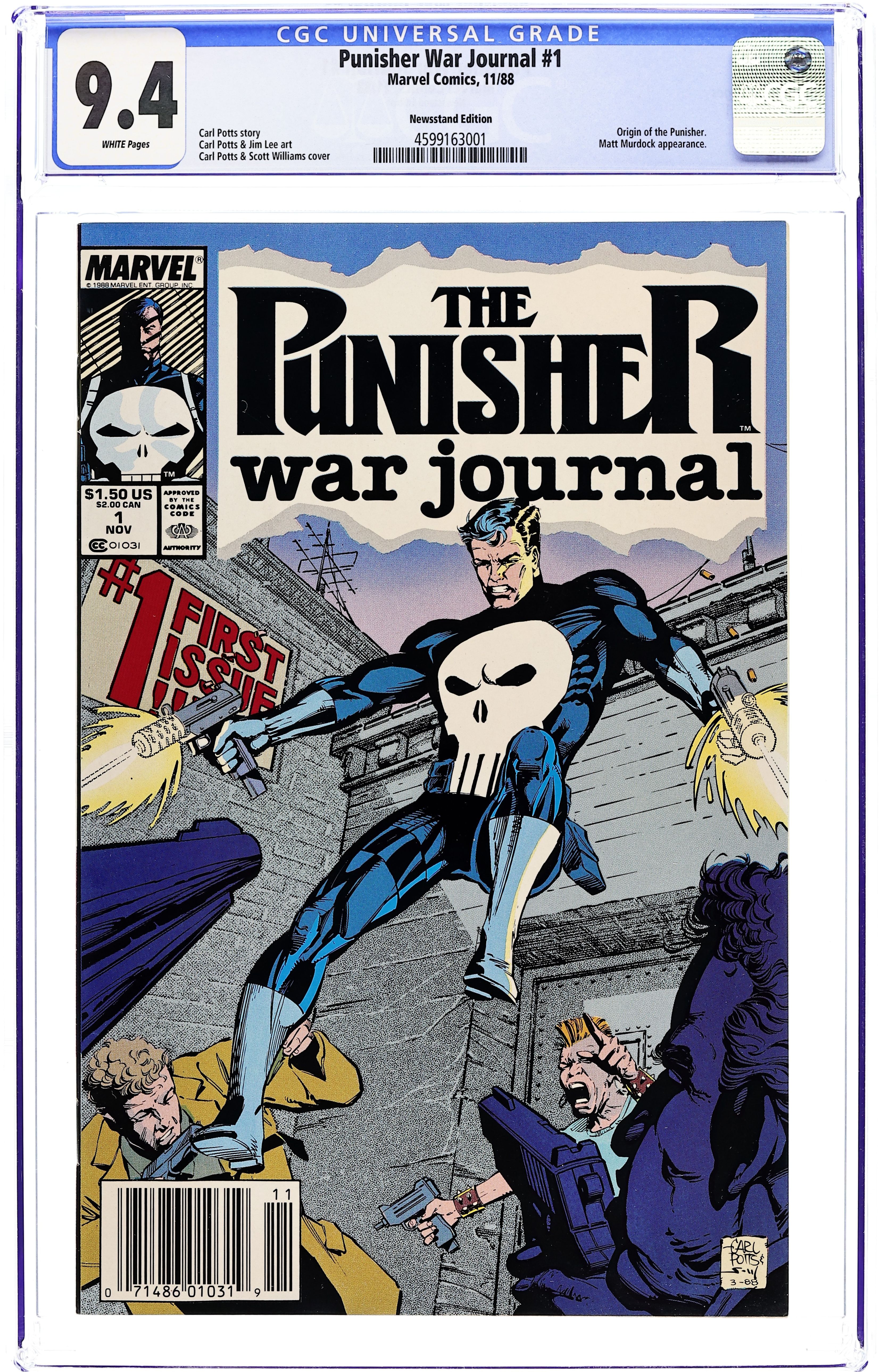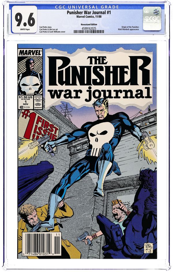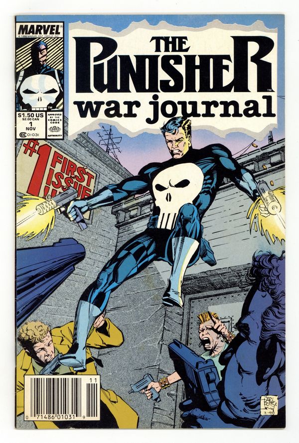 Newsstand Edition. Cover art by Carl Potts and Scott Williams. An Eye for an Eye Chapter One Sunday in the Park, script by Carl Potts, pencils by Carl Potts and Jim Lee, inks by Jim Lee; Punisher shoots some criminals and recalls his family's death in Central Park. Profiles of this issue's creators. 36 pgs. $1.50. Cover price $1.50.