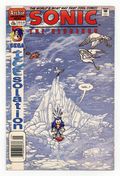 Newsstand Edition. "I Herd It Through the Pipeline!" (Benny Lee, Ron, Pam Eklund & Andrew Pepoy): The Freedom Fighters take on their most dangerous mission yet as they travel to the Frozen North Sea to free Rotor's herd from Robotnik's control! They plan on using Sally's mystical Sword of Acorns for the task... but can they make past the Robo-Eels and Ice-Bots alive?! "The Crush" (Karl Bollers & J. Axer): Sally and Mina have it out about Sonic. "Reunification Part Four" (Ken Penders & Dawn Best): The thrilling saga comes to its exciting conclusion. Don't miss the action and intrigue! Featuring a pulse-pounding cover by fan- favorite SPAZ! FC, 32pg$1.99 Cover price $1.99.