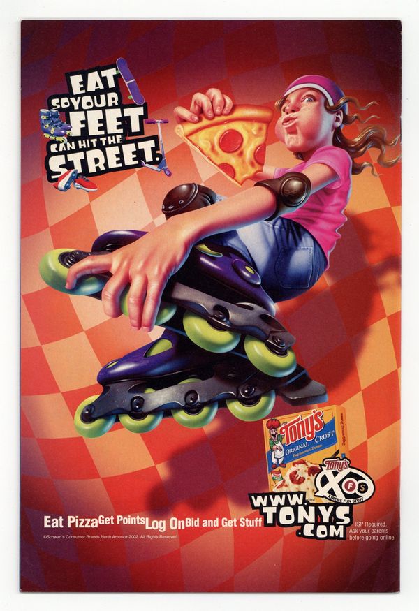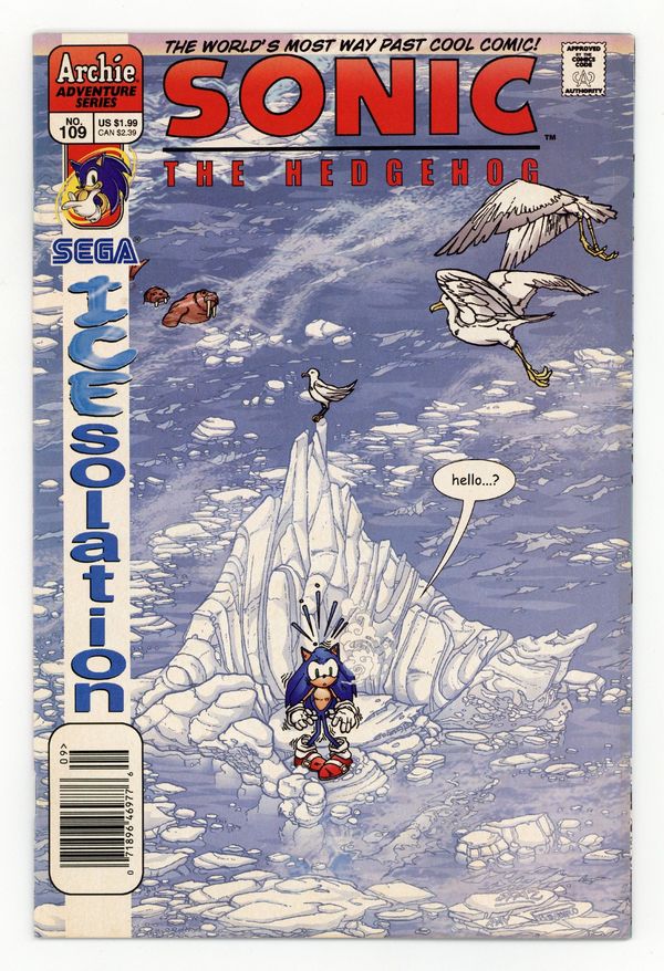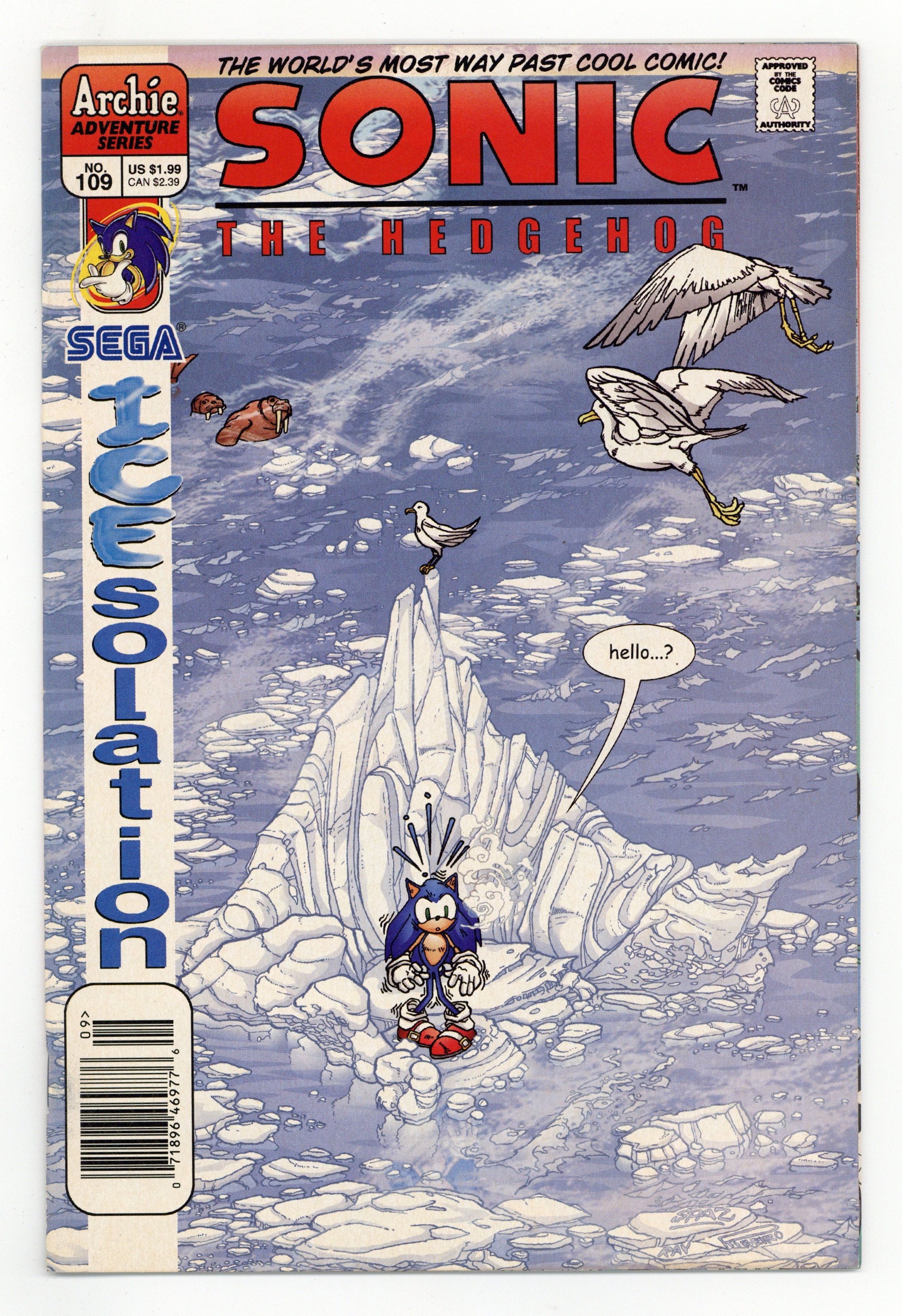 Published Jun 2002 by Archie Publications.$15.00Newsstand Edition. "I Herd It Through the Pipeline!" (Benny Lee, Ron, Pam Eklund & Andrew Pepoy): The Freedom Fighters take on their most dangerous mission yet as they travel to the Frozen North Sea to free Rotor's herd from Robotnik's control! They plan on using Sally's mystical Sword of Acorns for the task... but can they make past the Robo-Eels and Ice-Bots alive?! "The Crush" (Karl Bollers & J. Axer): Sally and Mina have it out about Sonic. "Reunification Part Four" (Ken Penders & Dawn Best): The thrilling saga comes to its exciting conclusion. Don't miss the action and intrigue! Featuring a pulse-pounding cover by fan- favorite SPAZ! FC, 32pg$1.99 Cover price $1.99.