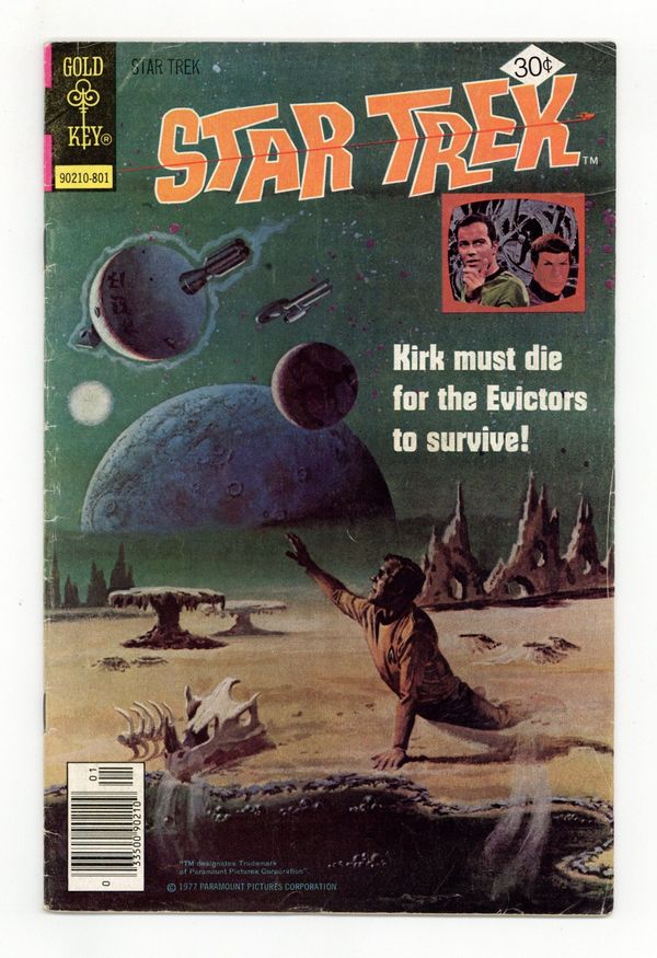 Number/month on cover: none listed. Comic book version of the original Star Trek TV series that starred William Shatner and Leonard Nimoy. This issue features "Destination...Annihilation!" in which a peacekeeping mission to two warring planets becomes complicated when a passenger on board the Enterprise is mistaken for one of the planet's deity. Story by George Kashdan and art by Al McWilliams. Cover price $0.30.