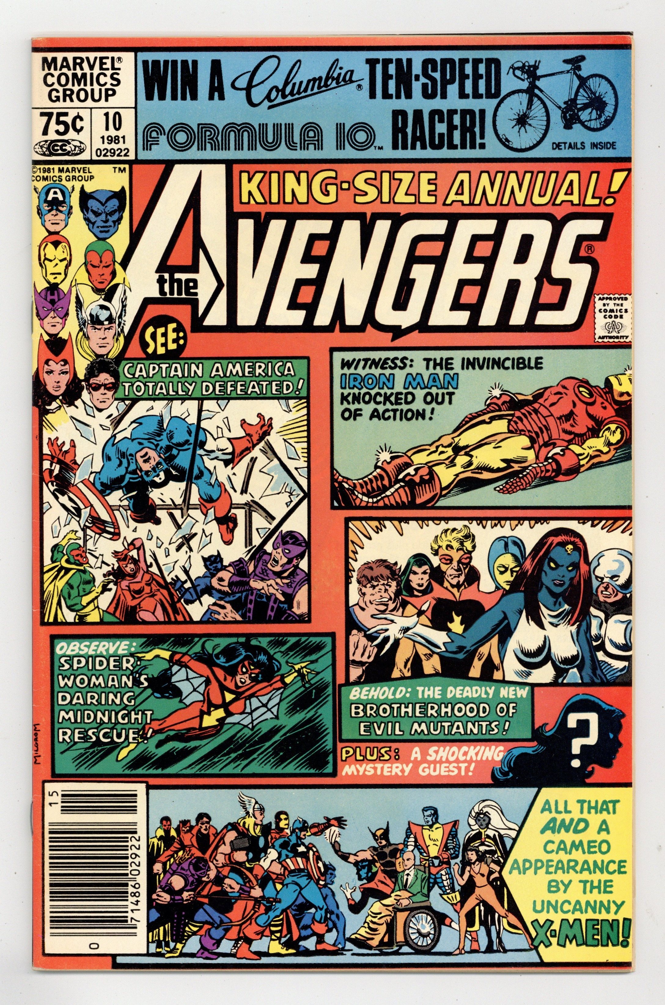Newsstand Edition. First appearance of Rogue and Madelyne Pryor in "By My Friends Betrayed!" Spider-Woman, X-Men, Carol Danvers, and New Brotherhood of Mutants guest star. Script by Chris Claremont. Pencils by Michael Golden. Inks by Armando Gil. Cover by Al Milgrom. This action-packed annual has got it all, true believers: the first appearance of Rogue, the spectacular art of Michael Golden, the tragic return of Carol Danvers, and the stupendous struggle between the Brotherhood of Evil Mutants and the mighty Avengers! Following the events of Uncanny X-Men #142, Mystique & her New Brotherhood of Evil Mutants attempt to break four of their members out of Ryker's Island prison! After Rogue and Mystique take down Captain America, Iron Man, and Thor, the rest of the Avengers and Spider-Woman catch up to the villains, and the epic clash erupts! Woven in and around the frantic action at Ryker's Island is the heartbreaking story of Carol Danvers' return to Earth. Her life has fallen apart since leaving for Limbo with Marcus Immortus in Avengers #200, and now, stripped of her powers and memories, Carol begins the long road to recovery. And the first step is an emotional confrontation with her former teammates! Notes: Marvel Super-Heroes #11 (Fall 1992) fills in the details of Carol Danvers' life between Avengers #200 and Avengers Annual #10. The Thing stars in a one-page Hostess ad, "A Lesson to Be Learned!" This issue was reprinted in 1993 in the trade paperback: The Greatest Battles of the Avengers. 52 pages, full color. Cover price $0.75.