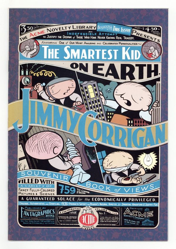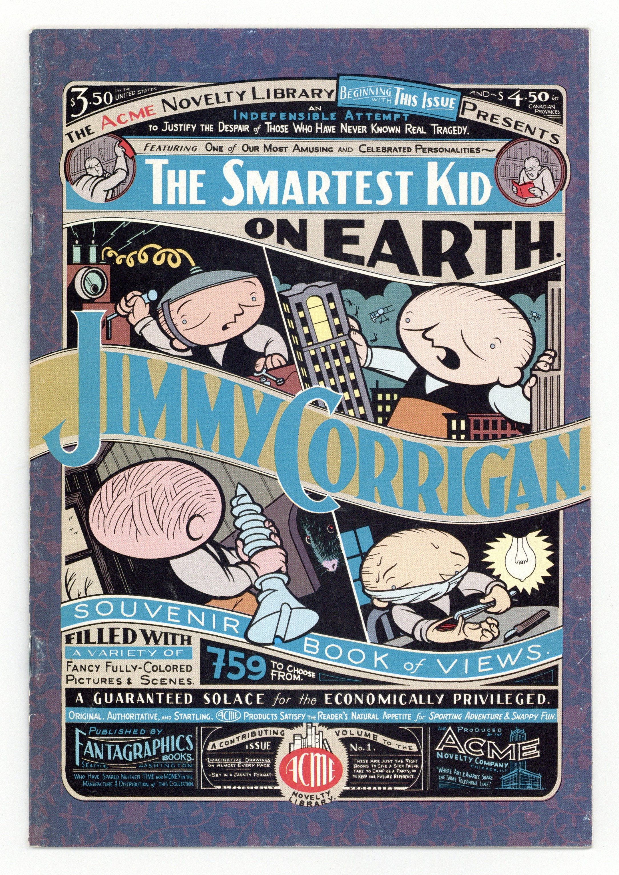 Published Apr 1994 by Fantagraphics.$90.001st app Jimmy Corrigan, Smartest Kid on Earth. Cover art by Chris Ware. Untitled Jimmy Corrigan story; Jimmy rustles up a new dad. Untitled Jimmy Corrigan story; God berates Jimmy for his dull life. Untitled Jimmy Corrigan story; Jimmy fantasies about a possible course for his life. Jimmy Gets Out Of The House; Young Jimmy makes a rocket ship and tries it out. Cut out and construct model of the Jimmy robot on the back cover. Scripts and art by Chris Ware. 36 pgs. $3.50. Cover price $3.50.