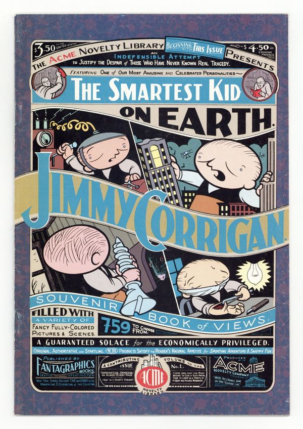 Published Apr 1994 by Fantagraphics.$66.001st app Jimmy Corrigan, Smartest Kid on Earth. Cover art by Chris Ware. Untitled Jimmy Corrigan story; Jimmy rustles up a new dad. Untitled Jimmy Corrigan story; God berates Jimmy for his dull life. Untitled Jimmy Corrigan story; Jimmy fantasies about a possible course for his life. Jimmy Gets Out Of The House; Young Jimmy makes a rocket ship and tries it out. Cut out and construct model of the Jimmy robot on the back cover. Scripts and art by Chris Ware. 36 pgs. $3.50. Cover price $3.50.