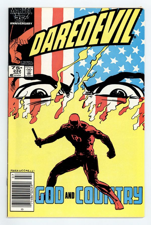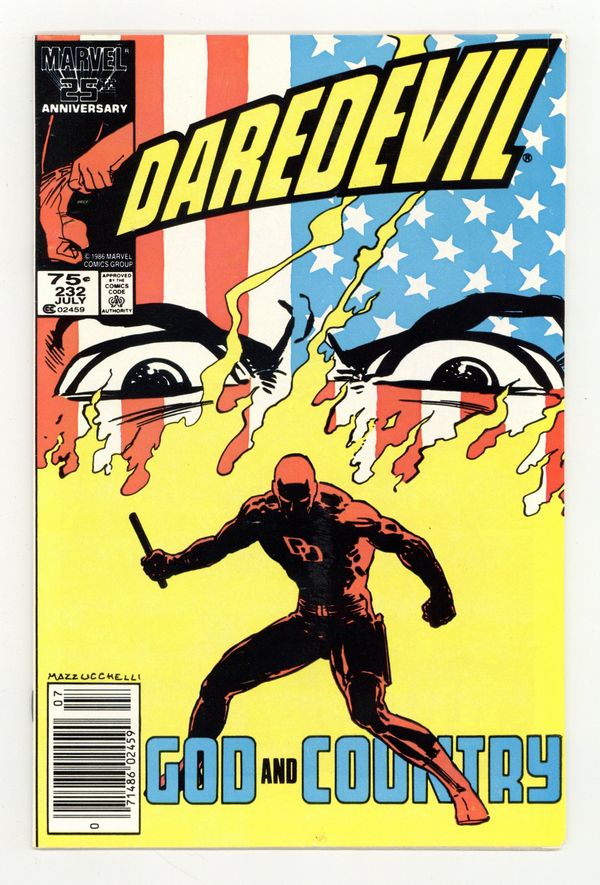 Newsstand Edition. Cover art by David Mazzucchelli. God and Country starring Daredevil, Karen Page, Foggy Nelson, Glorianna O'Breen, Ben Urich, Kingpin, and Nuke [Sgt. Simpson] (1st), script by Frank Miller, art by David Mazzucchelli; Matt helps Karen kick her drug habit; Kingpin hires a deranged Super Soldier to go after DD; part 6 of critically acclaimed Born Again storyline. 36 pgs. Cover price $0.75. Cover price $0.75.