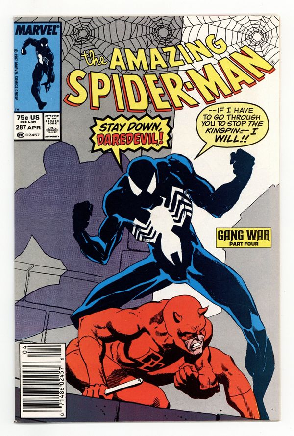 Newsstand Edition. Gang War: Part 4 of 5 -- "And There Shall Come a Reckoning" Guest-starring Daredevil and the Falcon. Script by Jim Owsley. Pencils by Erik Larsen. Inks by Art Nichols. Cover by Kyle Baker. At last the Kingpin is returning to New York! And the Falcon, Sergeant Tork, and Daredevil are going to make sure the wall-crawler doesnt interfere with the fat man's arrival! Wait a minute! Whose side are these guys on? The fighting mad web-slinger will take on all three to reach the Kingpin of Crime! In the meantime the crossing and double-crossing among the Rose, Hobgoblin, and Kingpin reaches new heights as each man maneuvers to finish on top when the gang war finally ends...next issue! Cameo appearances by the Arranger, Mary Jane Watson, Aunt May, Karen Page, Roderick Kingsley, Lance Bannon, and Redwing. (Note: The letters page contains a statement of ownership: average print run 474,098; average paid circulation 276,064.) 36 pages. Cover price $0.75.