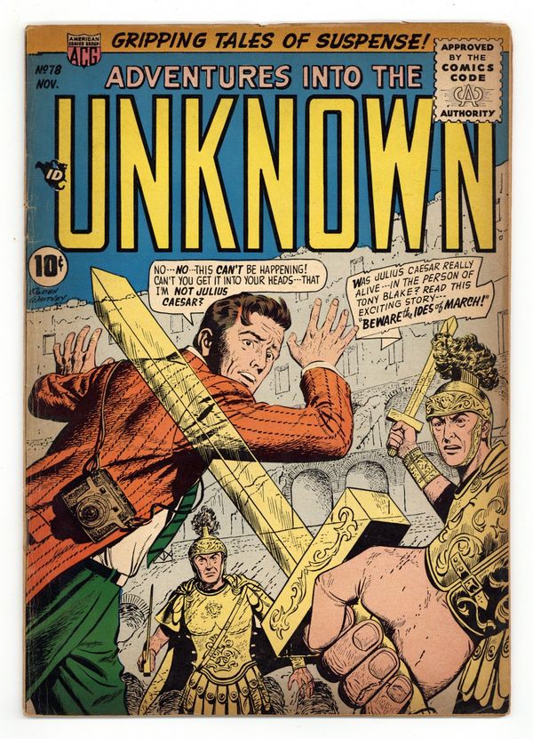 $15.75Cover art by Ogden Whitney. Rosie and Red Russia!, art by Ogden Whitney; Russian scientists capture an alien with special powers, but it turns out the alien was studying the scientists just as much as the scientists were studying the alien. Fabulous Animal text story. The Case of the Vanishing Indian--Uncanny Mysteries; Ed Morris, a rancher, gets into an accident and is saved by the ghost of an Indian with a withered arm. Beware the Ides of March, art by John Rosenberger; Tony Blake goes through life having accidents on the 15th of March every year, and knows Latin without having been taught it. He becomes a brilliant military strategist and everything he does echoes the life of Julius Caesar. The Second Mrs. Manion! What's Behind That Superstition? No. 1: The Broken Mirror; Dr. Orin Blakely of the Institute of Psychic Research explains the origins of the superstitions surrounding breaking mirrors. 36 pgs. Cover price $0.10.