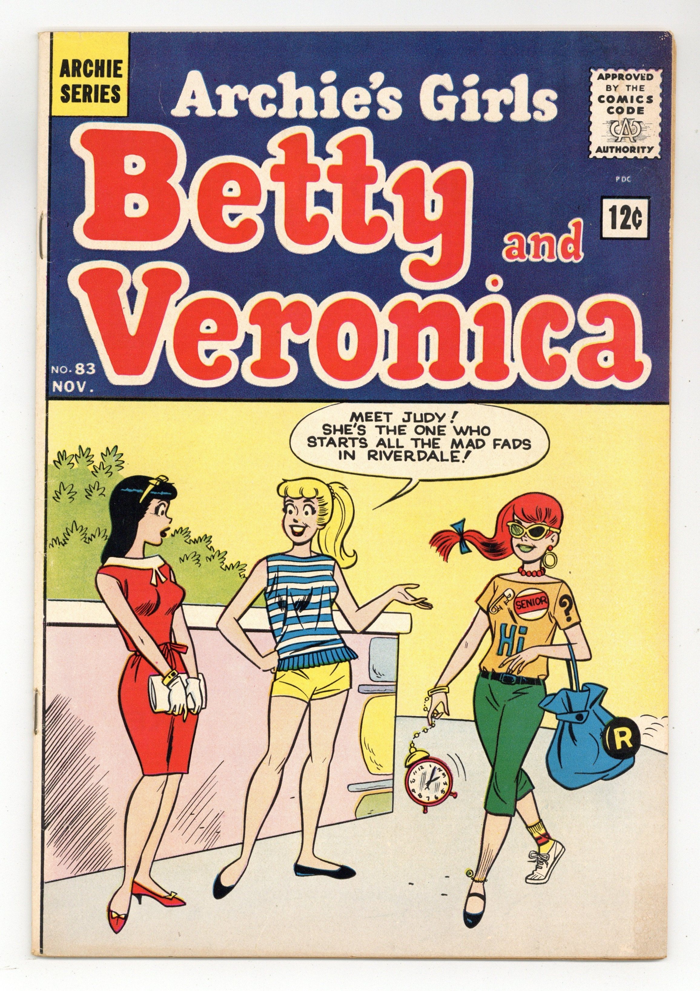 Cover pencils by Dan DeCarlo, inks by Rudy Lapick. "Commercial Caper," script by Frank Doyle, pencils by Dan DeCarlo, inks by Rudy Lapick; Betty blows up "Archie Loves Betty" balloons and sends them flying all over town. "Money Over Honey," pencils by Dan DeCarlo; Betty and Cathy complain that Reggie neglects them by scavenging for money while on a date. "Backfire, pencils by Dan DeCarlo; Archie writes an article on male superiority for the school paper, which makes Veronica and Betty angry. Betty and Veronica Summer Fun ad. "Strike Bawl"; Betty and Veronica go bowling and with Moose's help turn the bowling alley into a shambles. Brief biography of singer Rick Nelson. "Home Groan!" one-page Li'l Jinx story, script and art by Joe Edwards. "Out on a Limb," pencils by Dan DeCarlo; Mr. Weatherbee thinks it's disgraceful when the high school girls wear skirts that show the knee and demands they wear longer skirts. 36 pgs., full color. $0.12. Cover price $0.12.