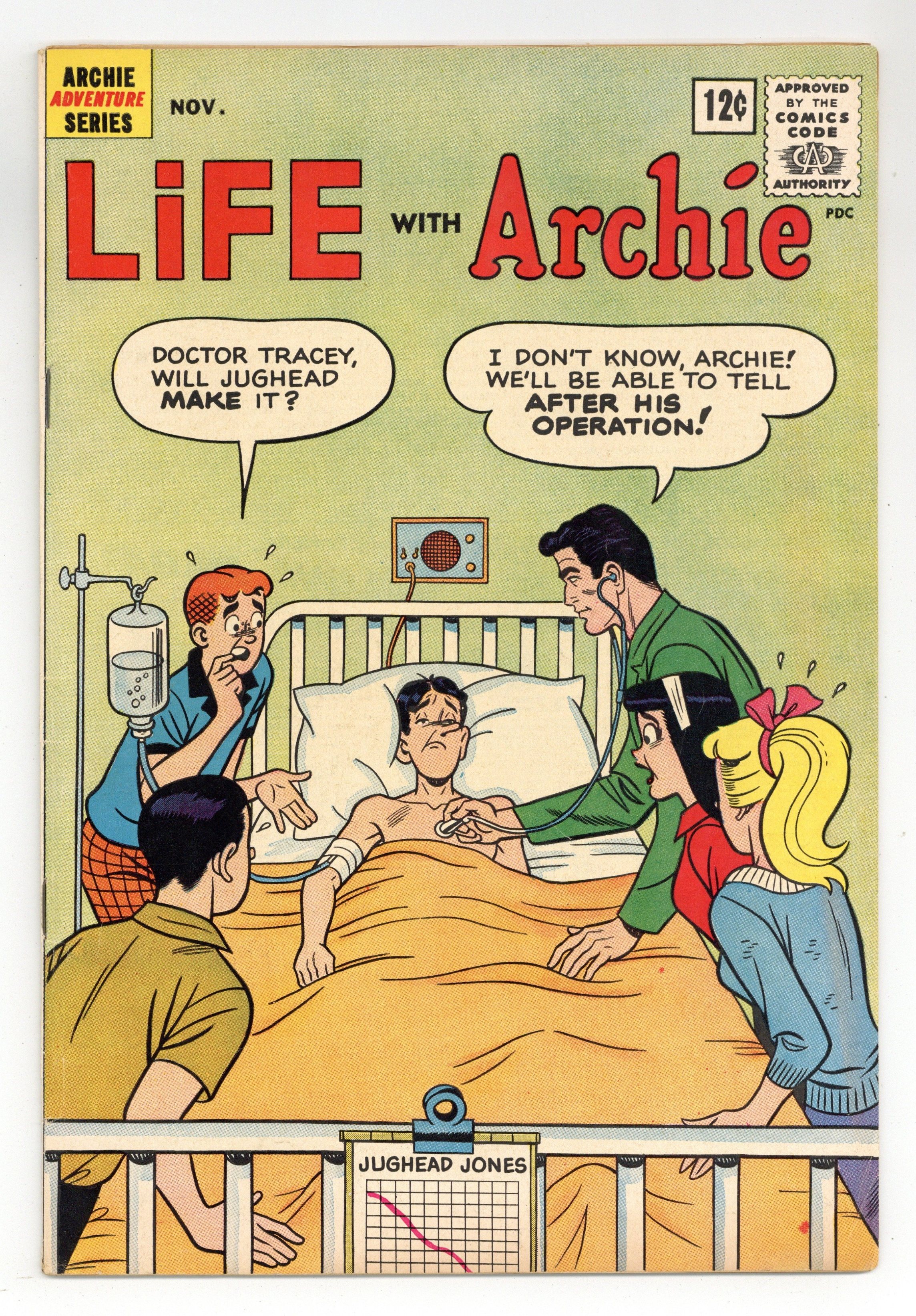 Tags: ArchiePublished Nov 1962 by Archie Publications.$21.50Cover art by Bob White. Book-length story in four chapters: "Juggie Plays It Straight," "Pardon My Operation," "A Fight For Life," and "Hail the Winner," script by Sy Reit, art by Bob White; Jughead has to go into the hospital for an operation, and the others worry he might not pull through. 36 pgs. $0.12. Cover price $0.12.