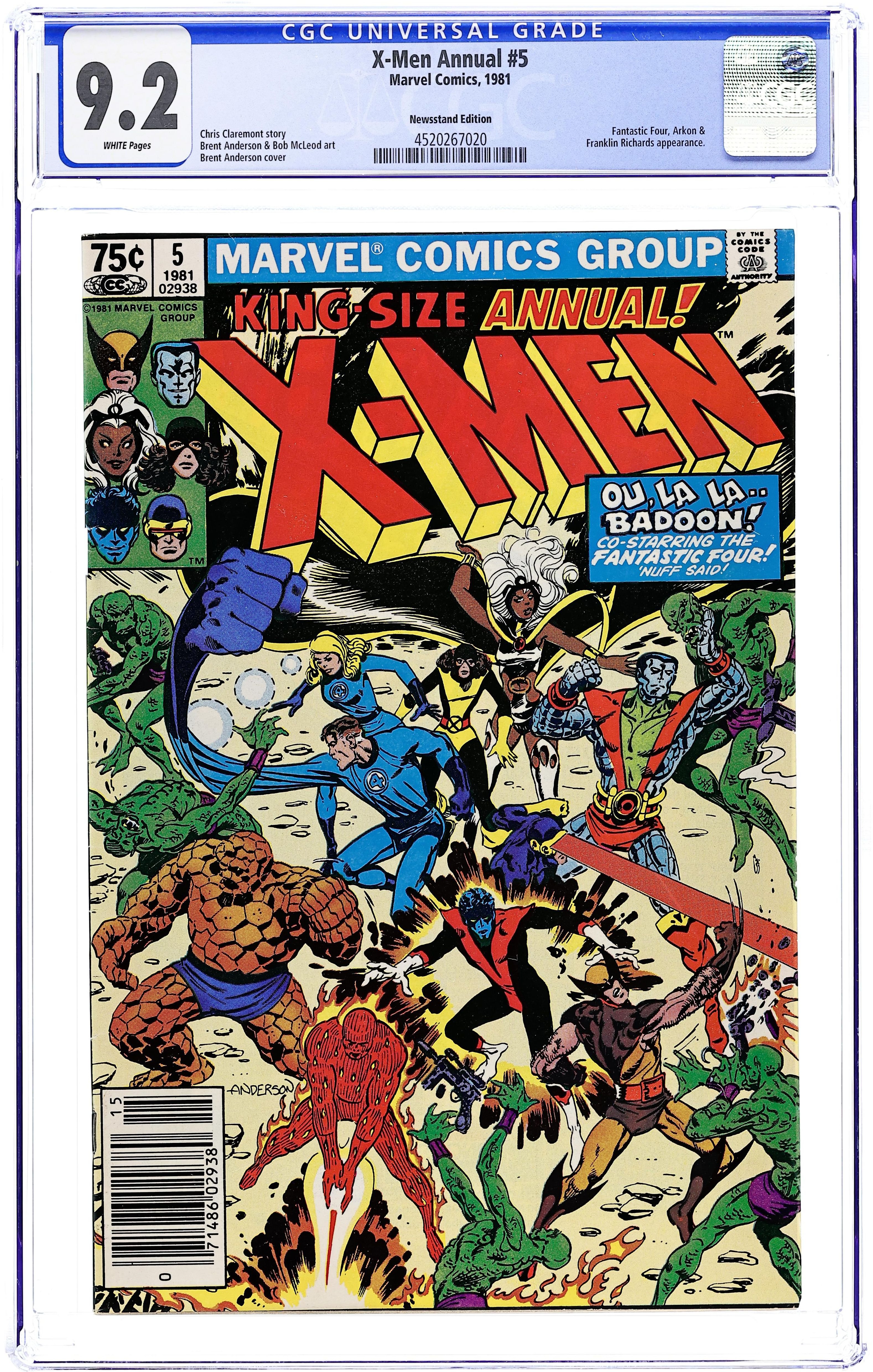 Newsstand Edition. Ou, La La -- Badoon! - Written by Chris Claremont. Art by Brent Anderson and Bob McLeod. Cover by Brent Anderson. The X-Men and the Invisible Girl travel to Arkon's world to save the rest of the Fantastic Four (who have been captured) and free Arkon's people from a Badoon invasion. Characters in this issue: X-Men [Professor X; Cyclops; Storm; Wolverine; Colossus; Nightcrawler; Kitty Pryde]; Arkon; Sashia; Imperions; D'syndri (first appearance and death); Moira MacTaggert; Franklin Richards; Fantastic Four [Mr. Fantastic; Invisible Girl; Human Torch; Thing]; VILLAINS: Brotherhood of the Badoon. 52 pages, full color. Cover price $0.75.