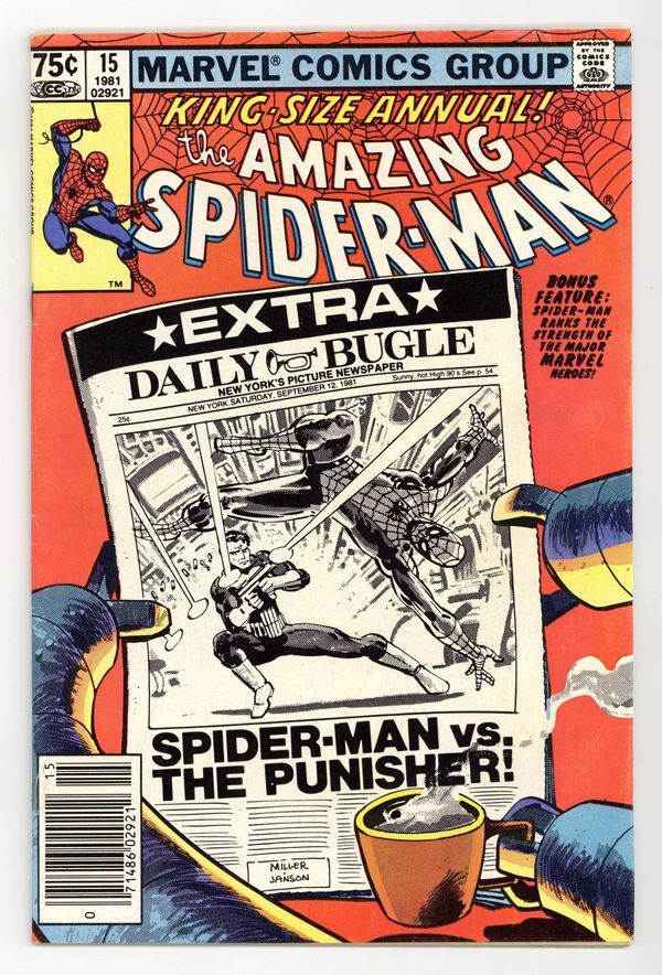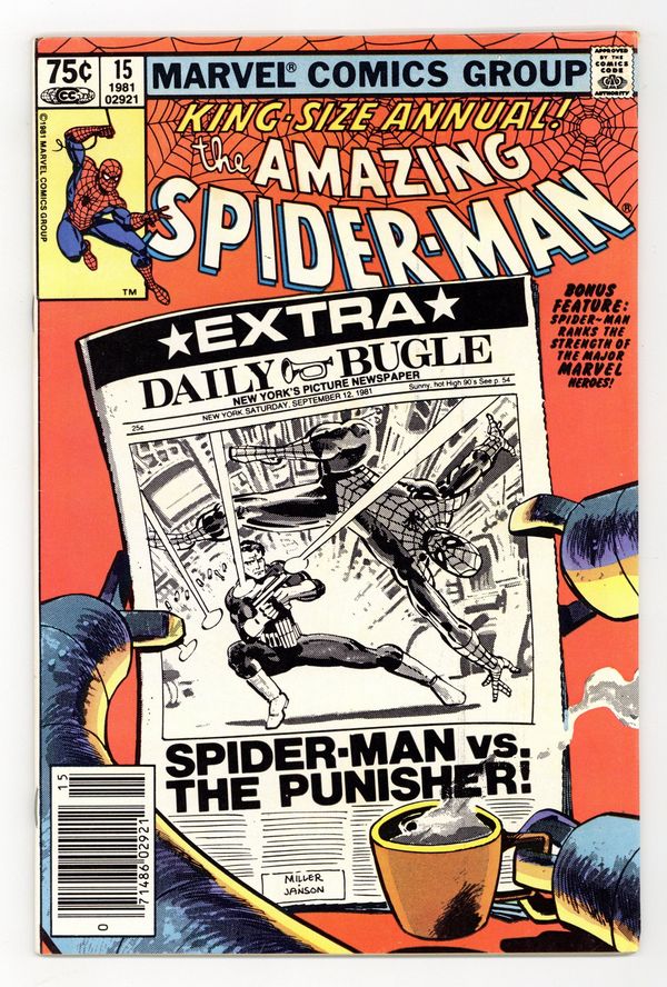 Tags: Spider-Man$24.00Newsstand Edition. "Spider-Man: Threat or Menace?" Guest-starring the Punisher. Script by Denny O'Neil. Art by Frank Miller (breakdowns) and Klaus Janson (finishes). Cover by Frank Miller and Klaus Janson. The dynamic art tandem that took the Daredevil series to new heights in the early 1980's teams up to bring Spider-Man and the Punisher together again! But this time the web-slinger and the gun-toting vigilante are not facing the likes of Jigsaw or the Hitman! Their adversary is a certain six-armed super-villain...planning nothing less than the murder of five million people! The Punisher takes the first shot at Dr. Octopus in the city morgue! And later on the wondrous wall-crawler takes the last one at the Daily Bugle! Can Spidey get the story to press before Doc Ock? An excellent annual! Second feature: "Just How Strong Is...Spider-Man?" Script by Mark Gruenwald. Art by Mark Gruenwald (layouts) and Bob Layton (finishes). The heroes of the Marvel Universe are ranked in order of their physical strength. The first tier consists of the Hulk, Hercules, Thor, Wonder Man, and Iron Man. The Thing and the Sub-Mariner headline the second tier. Spider-Man is in the third tier. This may be the first such "power ranking" attempted...thus making it a landmark backup feature. Third feature: "Peter Parker's Apartment!" Script by Roger Stern. Art by Marie Severin and Terry Austin. One-page illustration of Peter's Chelsea apartment correcting the errors in Amazing Spider-Man Annual 13. Fourth feature: "A Gallery of Spider-Man's Most Famous Foes!" Script by Roger Stern. Art by Keith Pollard, Greg LaRocque, and Frank Giacoia. 4 pages of pin-ups featuring the Man-Wolf, Jackal, Punisher, and Tarantula. (Notes: Dr. Octopus previously appeared in Captain America 259. The Punisher appears next in Daredevil 181 & 182. This story was reprinted in the trade paperback The Sensational Spider-Man (1988); and also in the (1994) Complete Frank Miller Spider-Man.) 52 pages. Cover price $0.75.