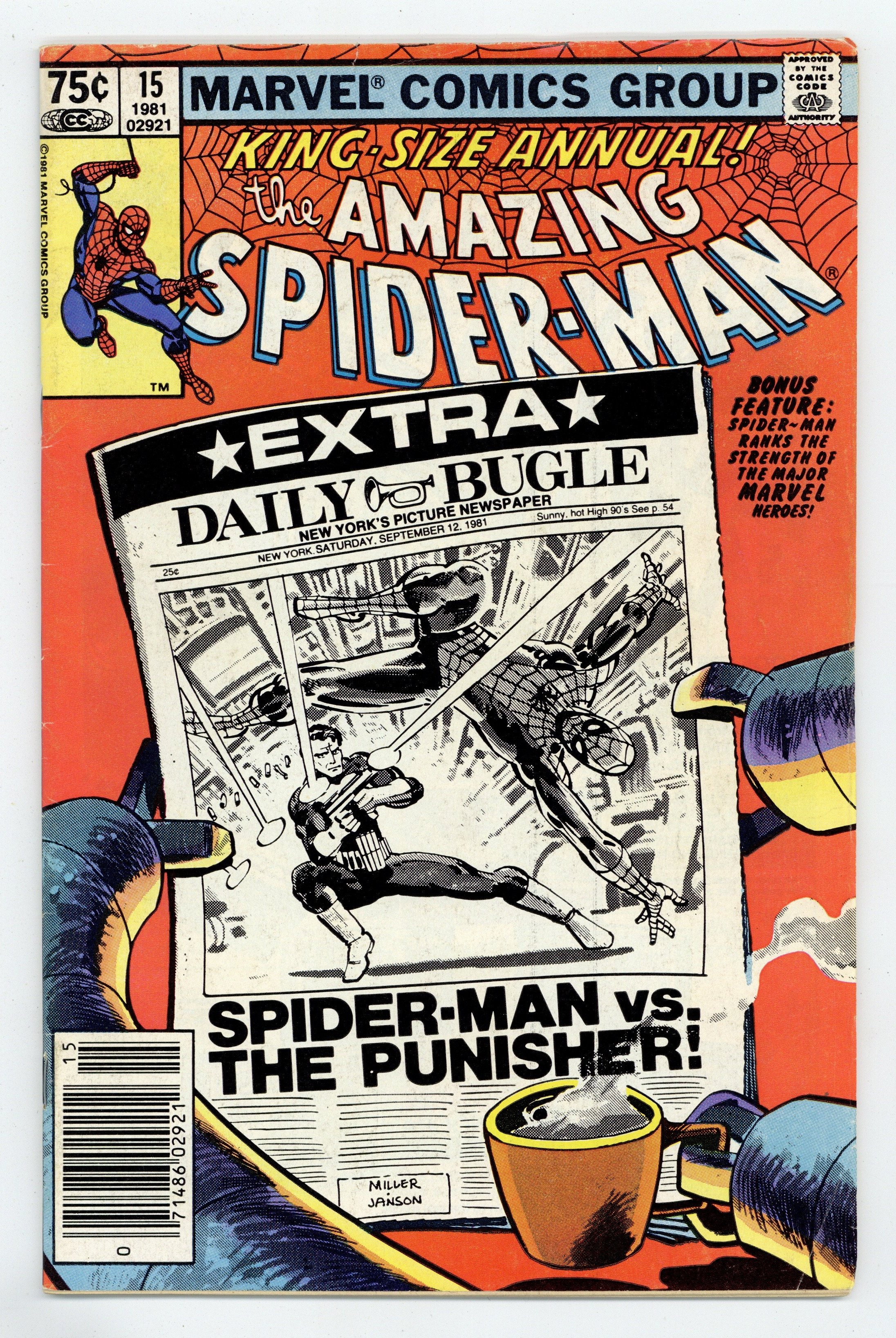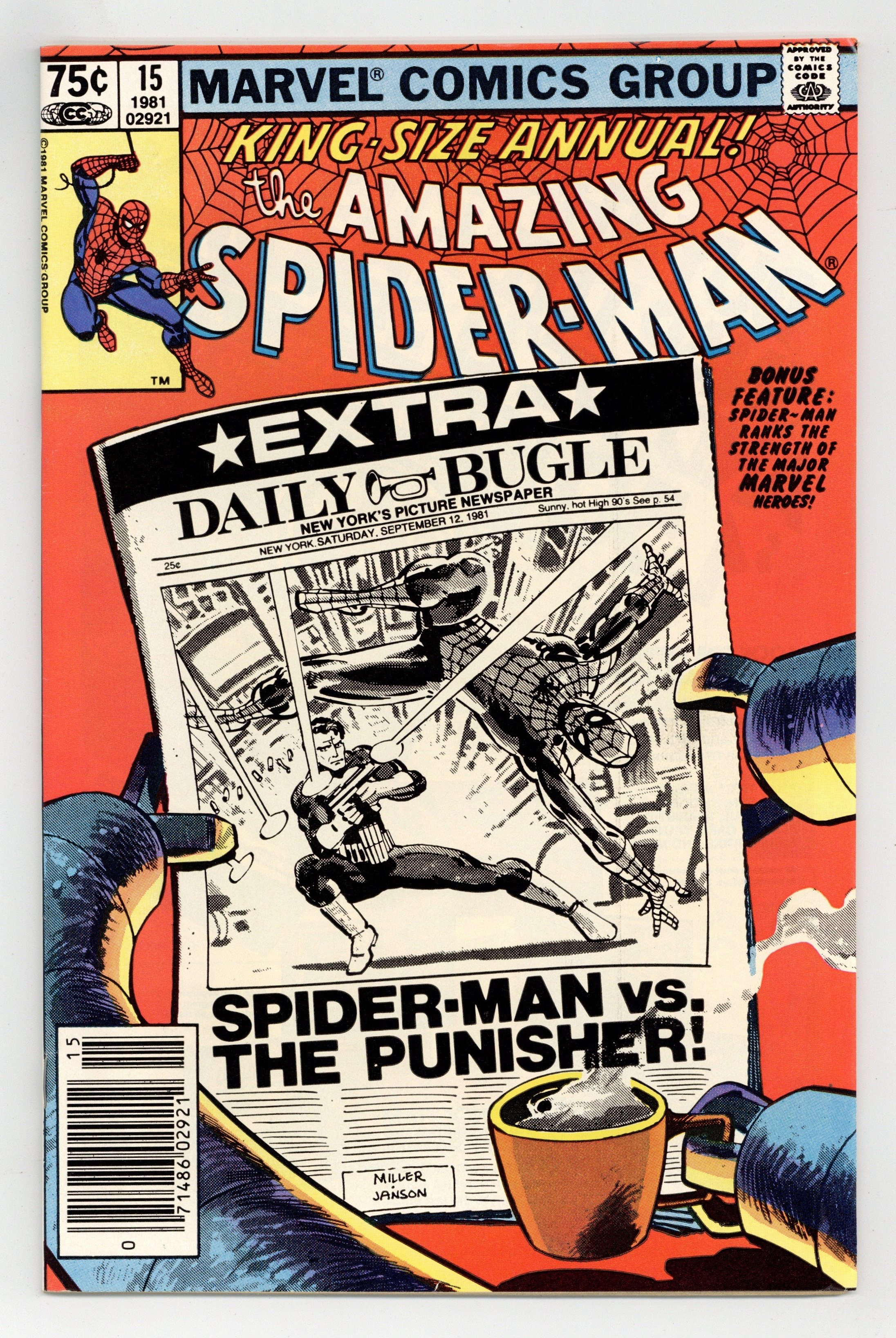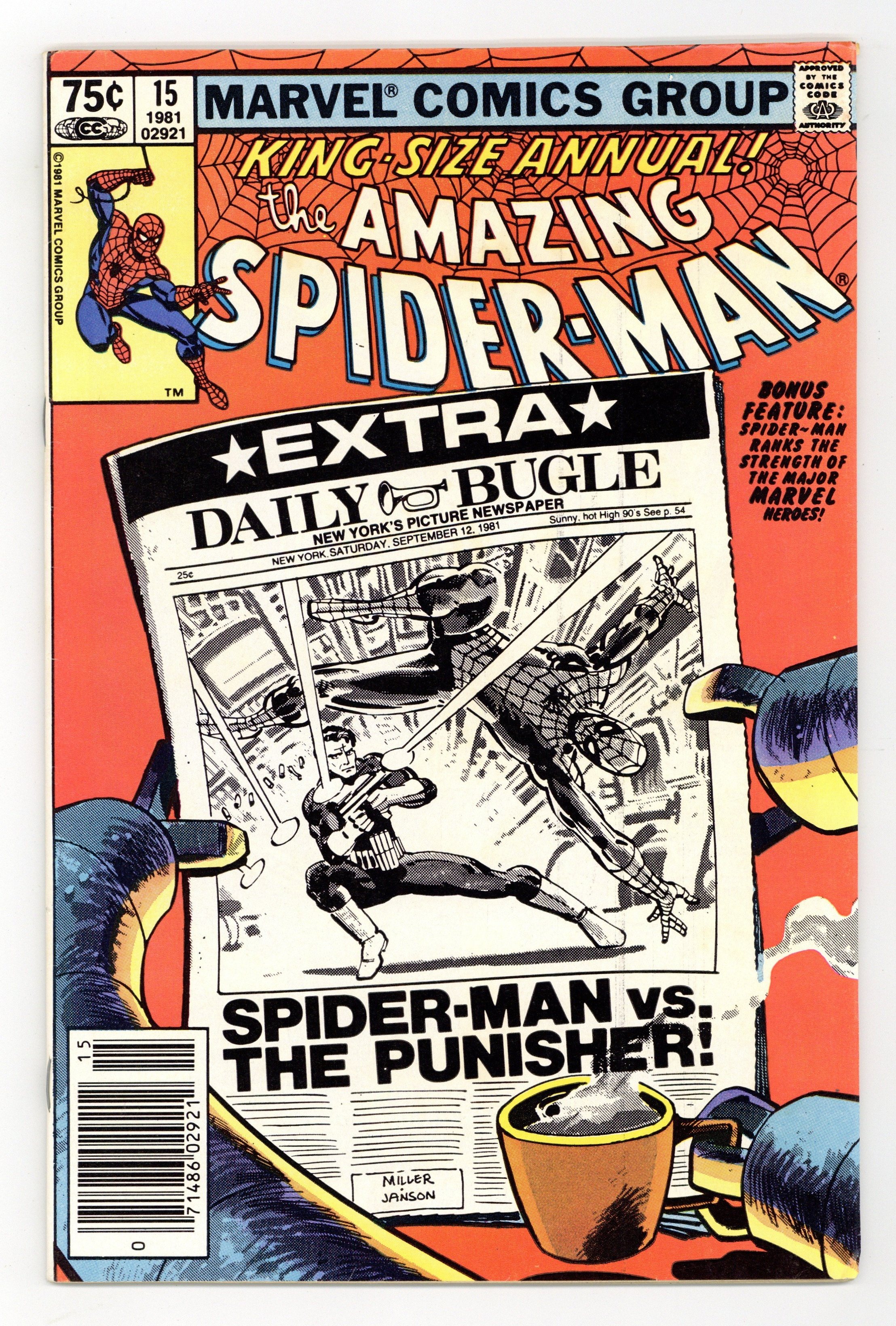 Newsstand Edition. "Spider-Man: Threat or Menace?" Guest-starring the Punisher. Script by Denny O'Neil. Art by Frank Miller (breakdowns) and Klaus Janson (finishes). Cover by Frank Miller and Klaus Janson. The dynamic art tandem that took the Daredevil series to new heights in the early 1980's teams up to bring Spider-Man and the Punisher together again! But this time the web-slinger and the gun-toting vigilante are not facing the likes of Jigsaw or the Hitman! Their adversary is a certain six-armed super-villain...planning nothing less than the murder of five million people! The Punisher takes the first shot at Dr. Octopus in the city morgue! And later on the wondrous wall-crawler takes the last one at the Daily Bugle! Can Spidey get the story to press before Doc Ock? An excellent annual! Second feature: "Just How Strong Is...Spider-Man?" Script by Mark Gruenwald. Art by Mark Gruenwald (layouts) and Bob Layton (finishes). The heroes of the Marvel Universe are ranked in order of their physical strength. The first tier consists of the Hulk, Hercules, Thor, Wonder Man, and Iron Man. The Thing and the Sub-Mariner headline the second tier. Spider-Man is in the third tier. This may be the first such "power ranking" attempted...thus making it a landmark backup feature. Third feature: "Peter Parker's Apartment!" Script by Roger Stern. Art by Marie Severin and Terry Austin. One-page illustration of Peter's Chelsea apartment correcting the errors in Amazing Spider-Man Annual 13. Fourth feature: "A Gallery of Spider-Man's Most Famous Foes!" Script by Roger Stern. Art by Keith Pollard, Greg LaRocque, and Frank Giacoia. 4 pages of pin-ups featuring the Man-Wolf, Jackal, Punisher, and Tarantula. (Notes: Dr. Octopus previously appeared in Captain America 259. The Punisher appears next in Daredevil 181 & 182. This story was reprinted in the trade paperback The Sensational Spider-Man (1988); and also in the (1994) Complete Frank Miller Spider-Man.) 52 pages. Cover price $0.75.