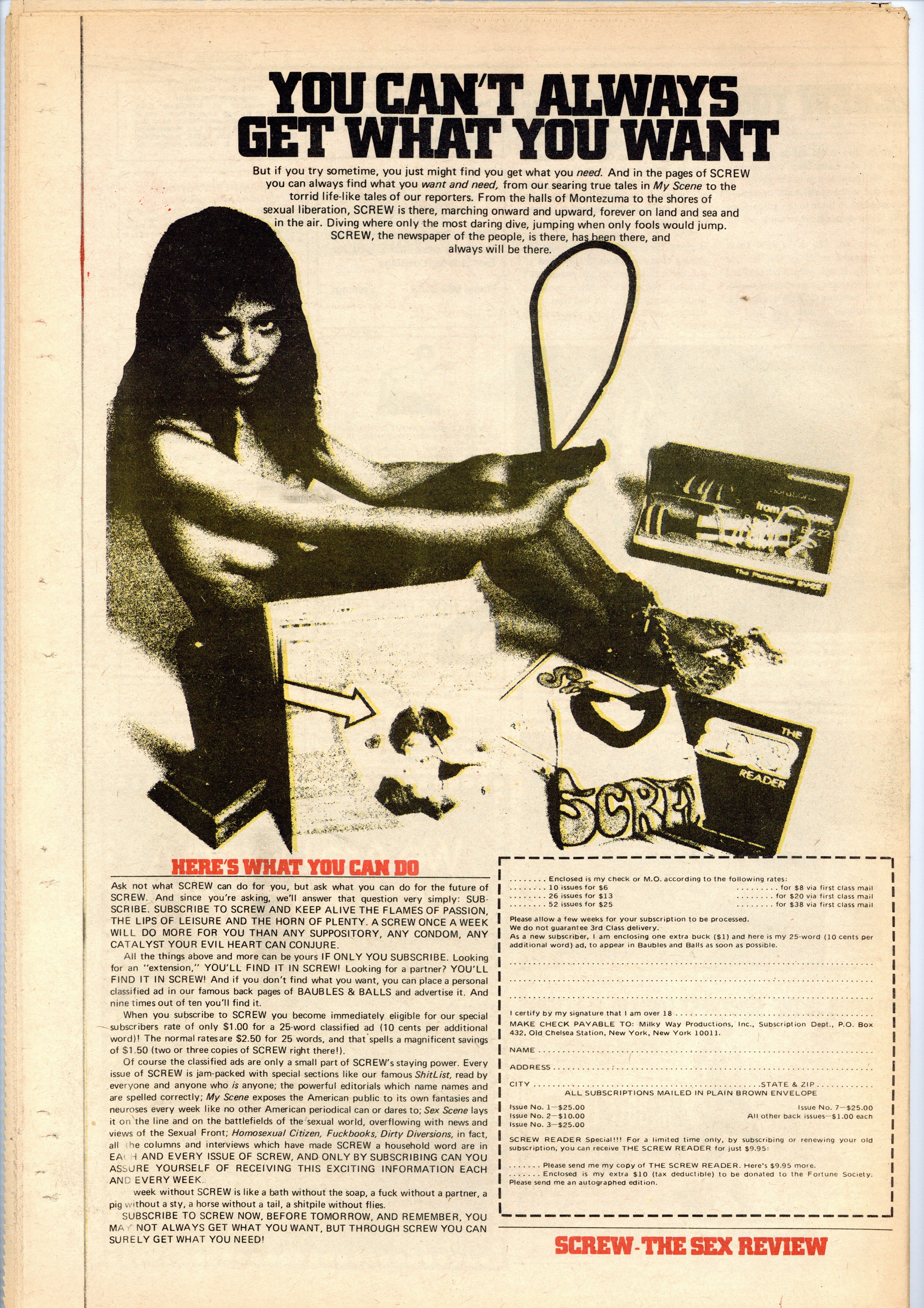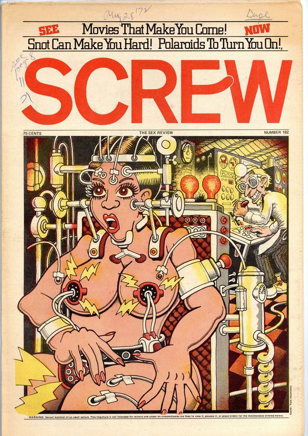 Published Aug 1972 by Milky Way Productions.$8.10Screw was a weekly tabloid newspaper published and edited by Al Goldstein and his Milky Way Productions. This New York based publication was notable for being a pioneer in bringing hardcore pornography into the American mainstream during the late 1960s and early 1970s. Cover by Tom Hachtman. Tabloid format, 11.5" x 16.75", 32 pages, B&W. ADULT MATERIAL Cover price $0.75.