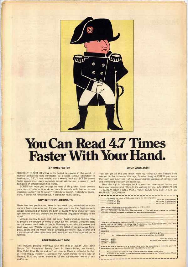 Published Jul 1972 by Milky Way Productions.$9.90Screw was a weekly tabloid newspaper published and edited by Al Goldstein and his Milky Way Productions. This New York based publication was notable for being a pioneer in bringing hardcore pornography into the American mainstream during the late 1960s and early 1970s. Cover by Rene Mocada. Tabloid format, 11.5" x 16.75", 32 pages, B&W. ADULT MATERIAL Cover price $0.75.