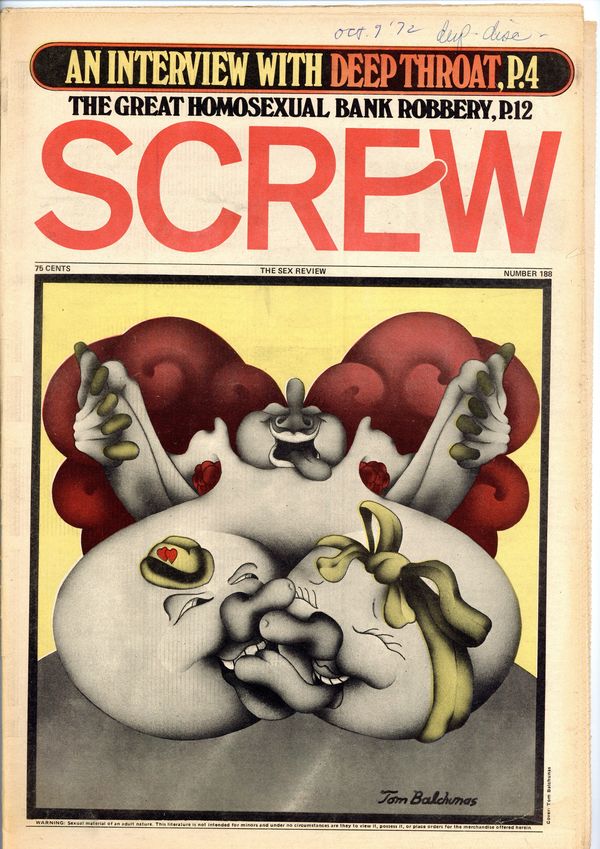 Published Oct 1972 by Milky Way Productions.$3.60Screw was a weekly tabloid newspaper published and edited by Al Goldstein and his Milky Way Productions. This New York based publication was notable for being a pioneer in bringing hardcore pornography into the American mainstream during the late 1960s and early 1970s. Cover by Tom Balchunas. Tabloid format, 11.5" x 16.75", 32 pages, B&W. ADULT MATERIAL Cover price $0.75.