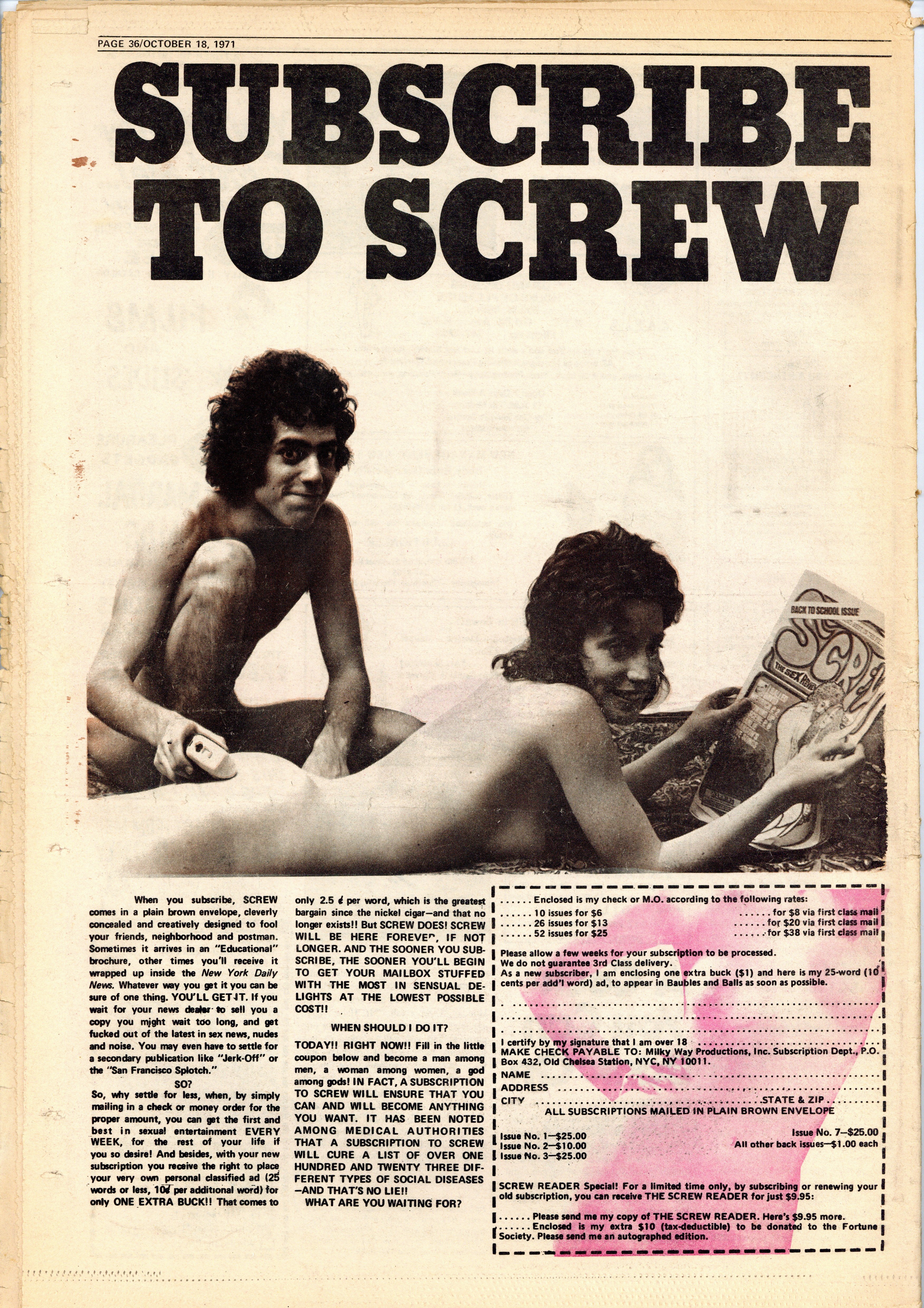 Published Oct 1971 by Milky Way Productions.$4.20Screw was a weekly tabloid newspaper published and edited by Al Goldstein and his Milky Way Productions. This New York based publication was notable for being a pioneer in bringing hardcore pornography into the American mainstream during the late 1960s and early 1970s. Tabloid format, 11.5" x 16.75", 36 pages, B&W. ADULT MATERIAL Cover price $0.75.