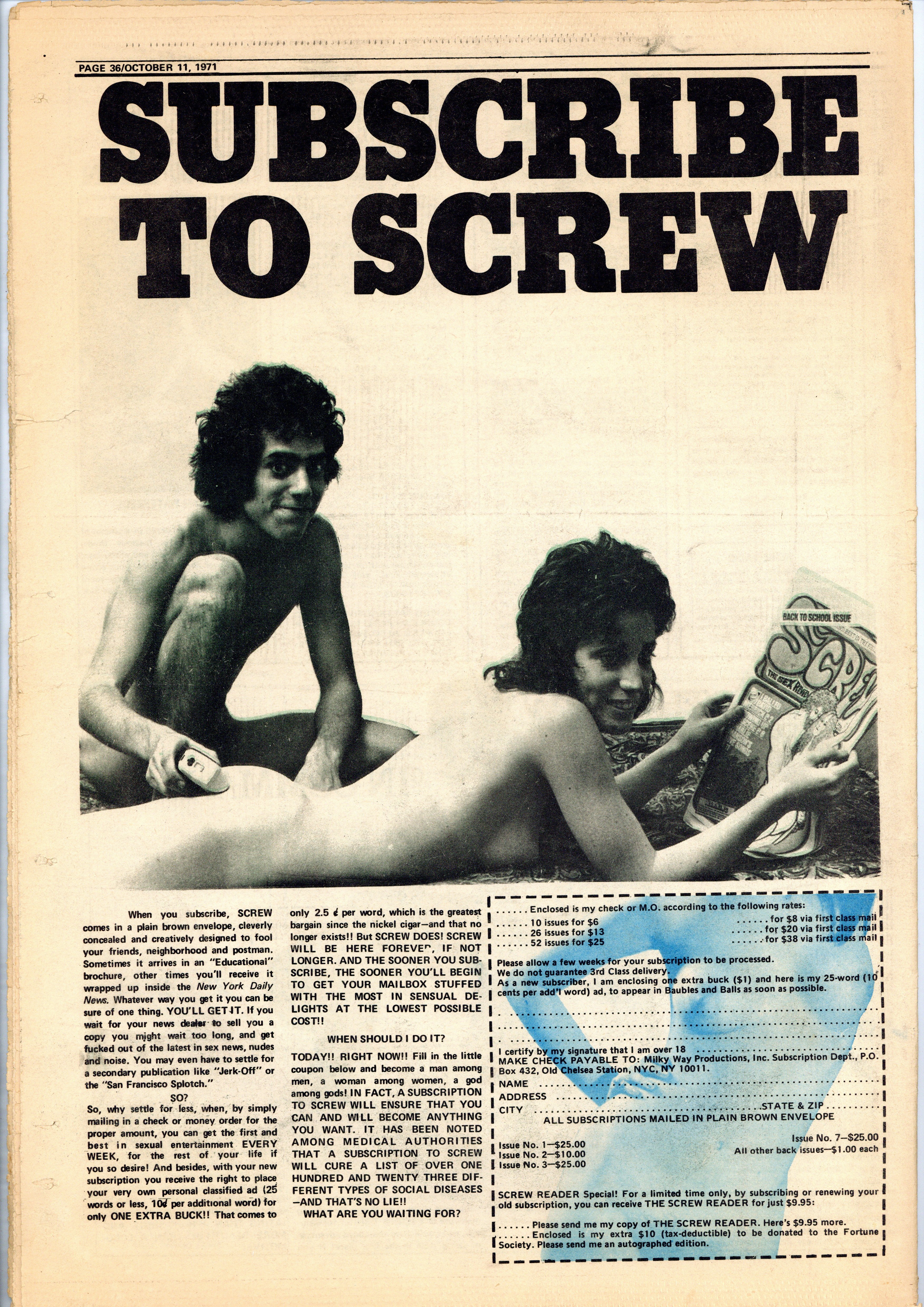 Published Oct 1971 by Milky Way Productions.$3.60Screw was a weekly tabloid newspaper published and edited by Al Goldstein and his Milky Way Productions. This New York based publication was notable for being a pioneer in bringing hardcore pornography into the American mainstream during the late 1960s and early 1970s. Tabloid format, 11.5" x 16.75", 36 pages, B&W. ADULT MATERIAL Cover price $0.50.