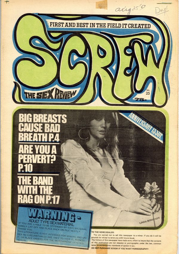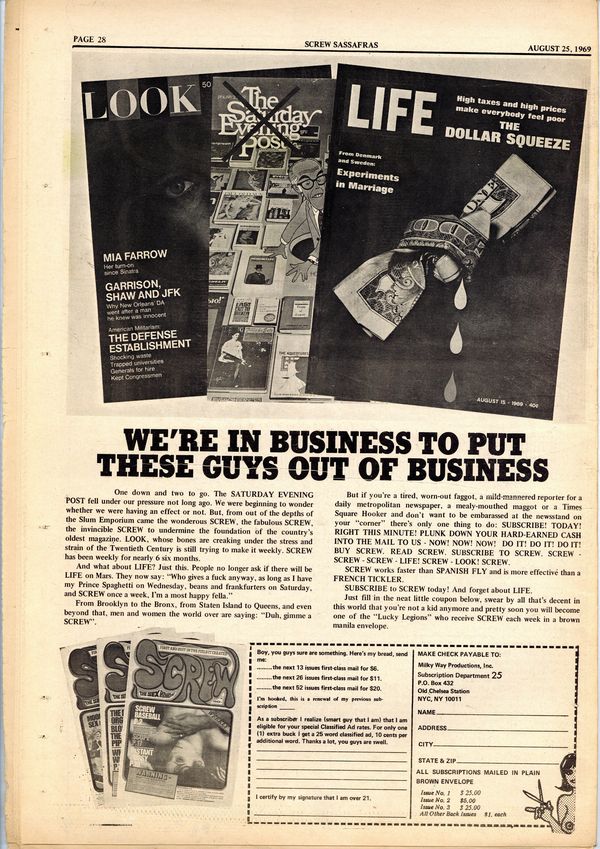 Published Aug 1969 by Milky Way Productions.$5.20Screw was a weekly tabloid newspaper published and edited by Al Goldstein and his Milky Way Productions. This New York based publication was notable for being a pioneer in bringing hardcore pornography into the American mainstream during the late 1960s and early 1970s. Tabloid format, 11.5" x 16.75", 28 pages, B&W. ADULT MATERIAL Cover price $0.75.