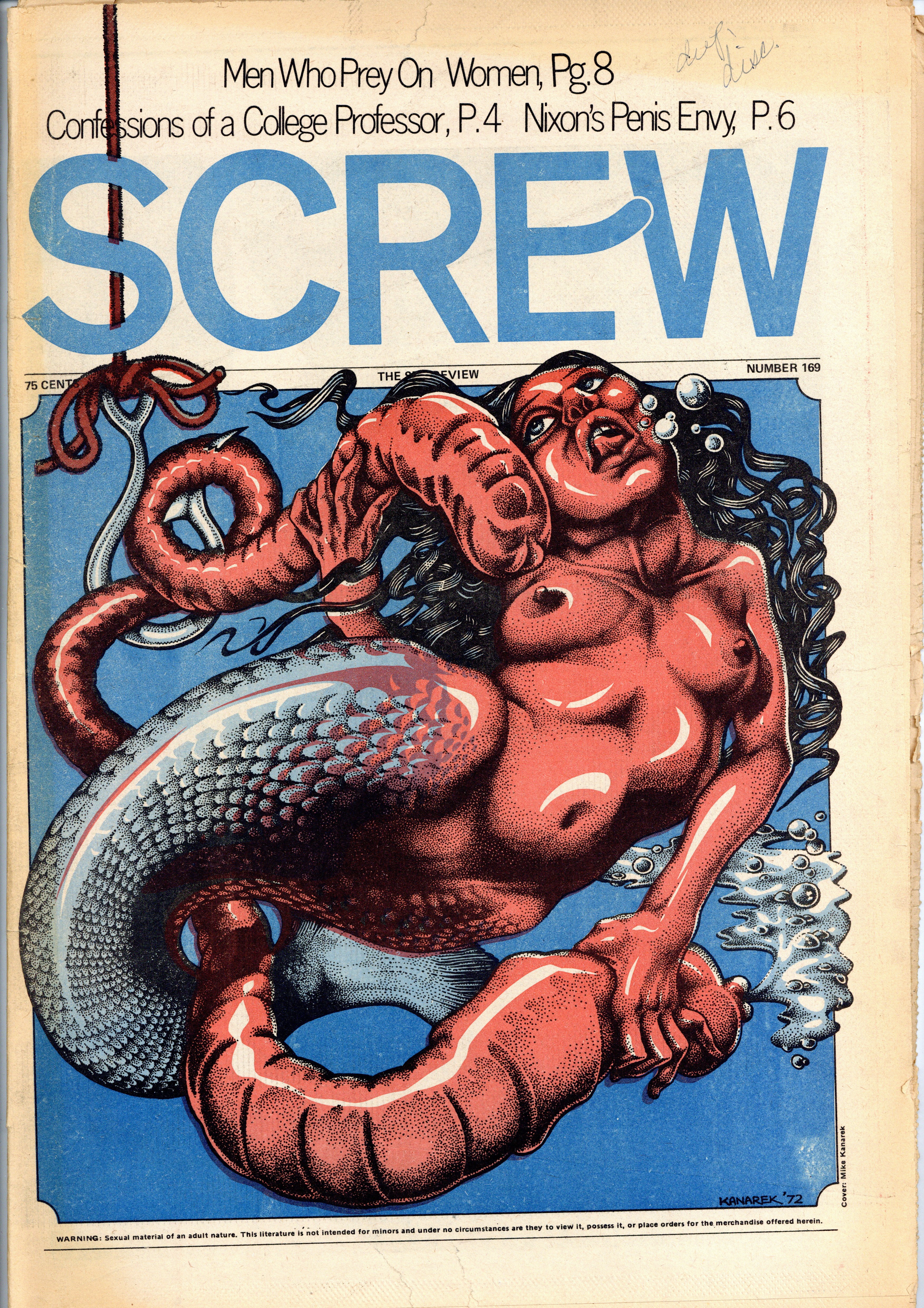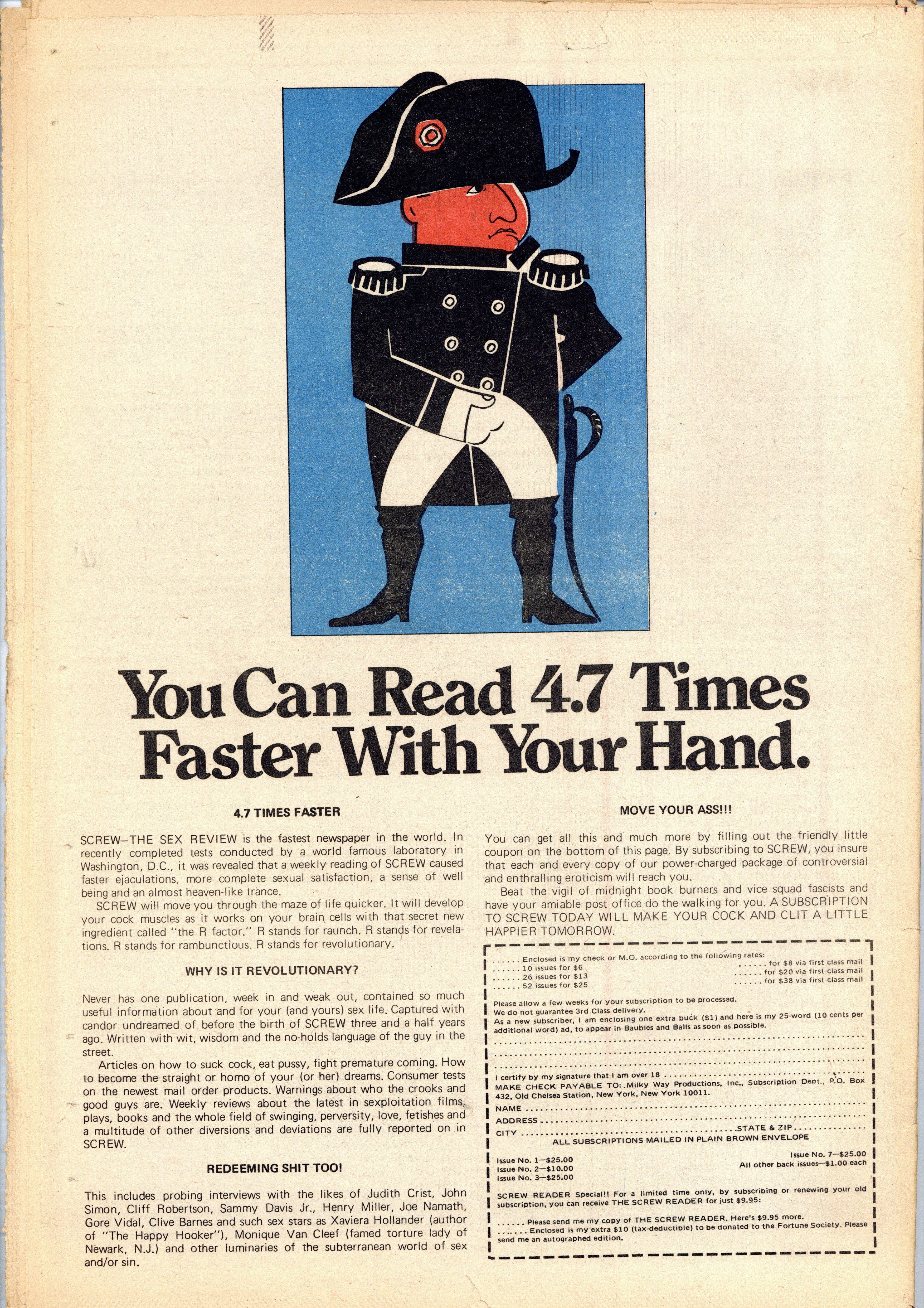 Published May 1972 by Milky Way Productions.$4.20Screw was a weekly tabloid newspaper published and edited by Al Goldstein and his Milky Way Productions. This New York based publication was notable for being a pioneer in bringing hardcore pornography into the American mainstream during the late 1960s and early 1970s. Cover by Mike Kanarek. Tabloid format, 11.5" x 16.75", 36 pages, B&W. ADULT MATERIAL Cover price $0.75.