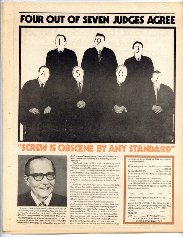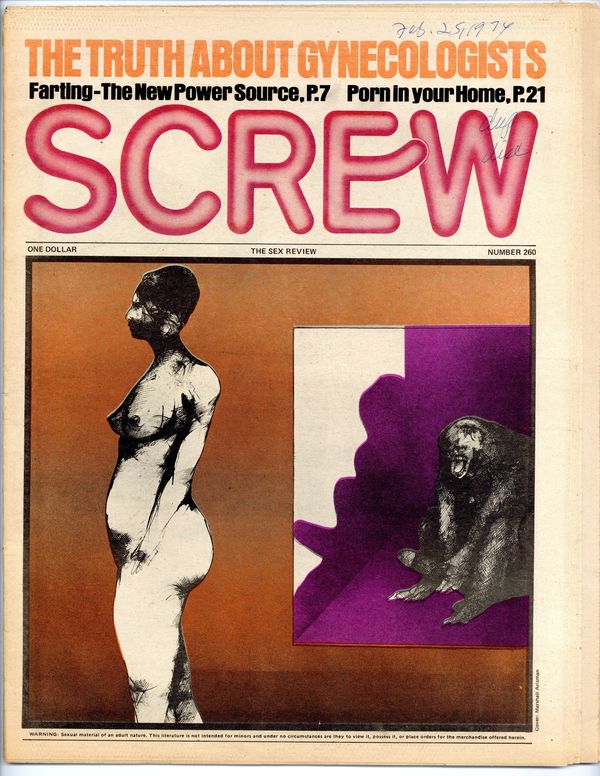 Published Feb 1974 by Milky Way Productions.$8.10Screw was a weekly tabloid newspaper published and edited by Al Goldstein and his Milky Way Productions. This New York based publication was notable for being a pioneer in bringing hardcore pornography into the American mainstream during the late 1960s and early 1970s. Cover by Marshall Arisman. Tabloid format, 11.5" x 14.75", 48 pages, B&W. ADULT MATERIAL Cover price $1.00.