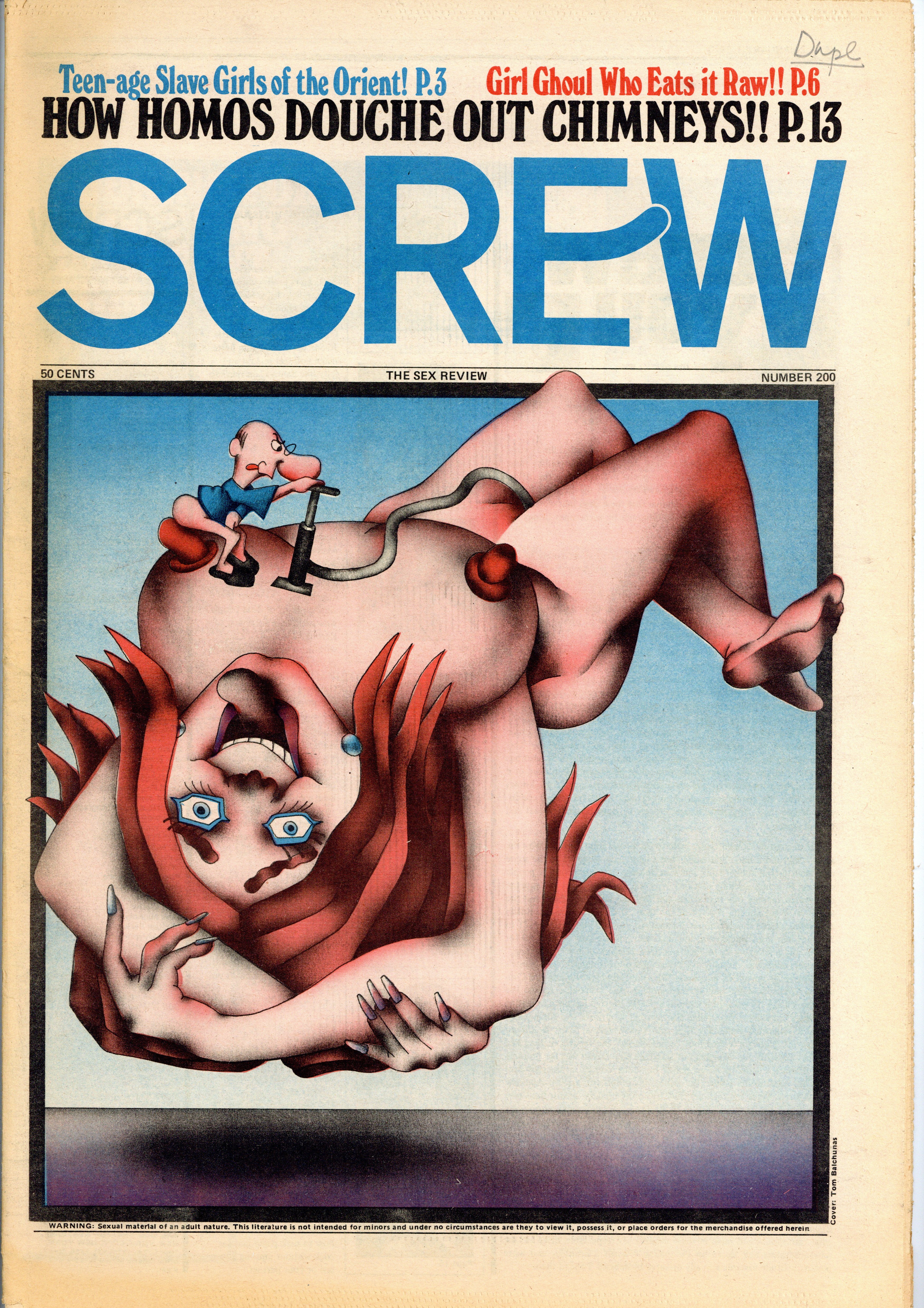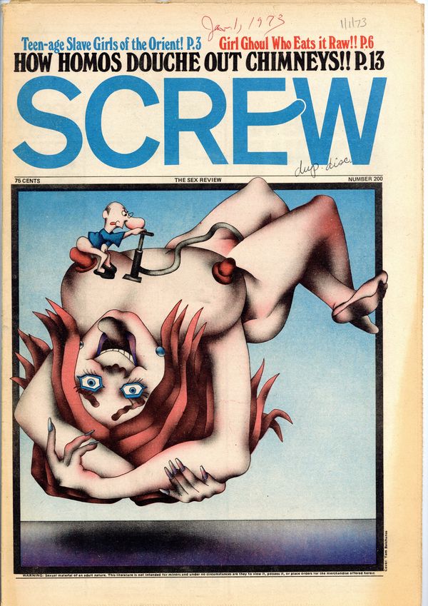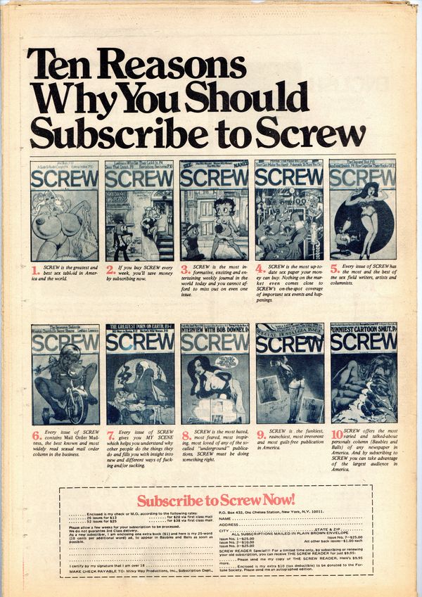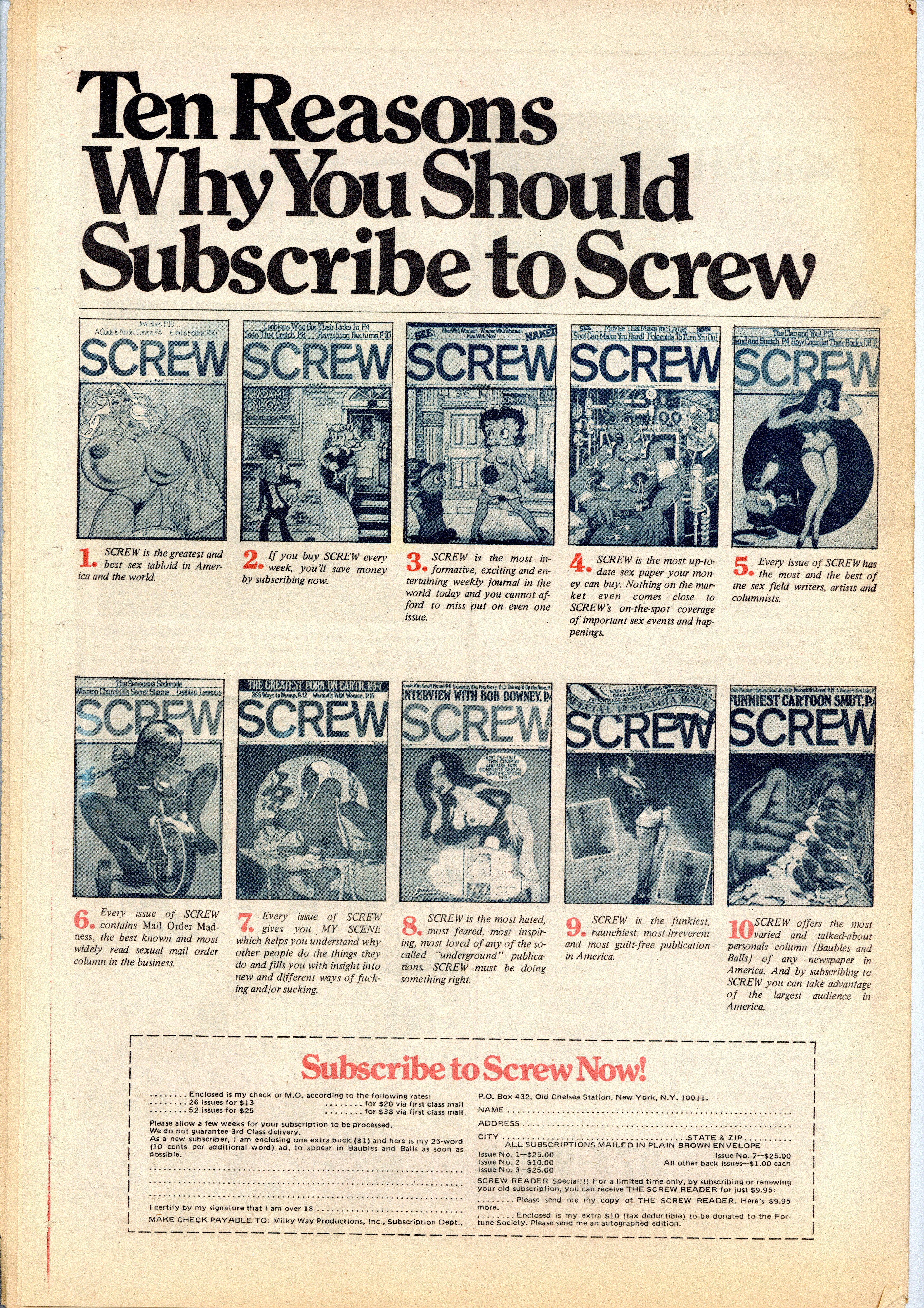 Published Jan 1973 by Milky Way Productions.$7.20Screw was a weekly tabloid newspaper published and edited by Al Goldstein and his Milky Way Productions. This New York based publication was notable for being a pioneer in bringing hardcore pornography into the American mainstream during the late 1960s and early 1970s. Cover by Tom Balchunas. Tabloid format, 11.5" x 16.75", 32 pages, B&W. ADULT MATERIAL Cover price $0.50.
