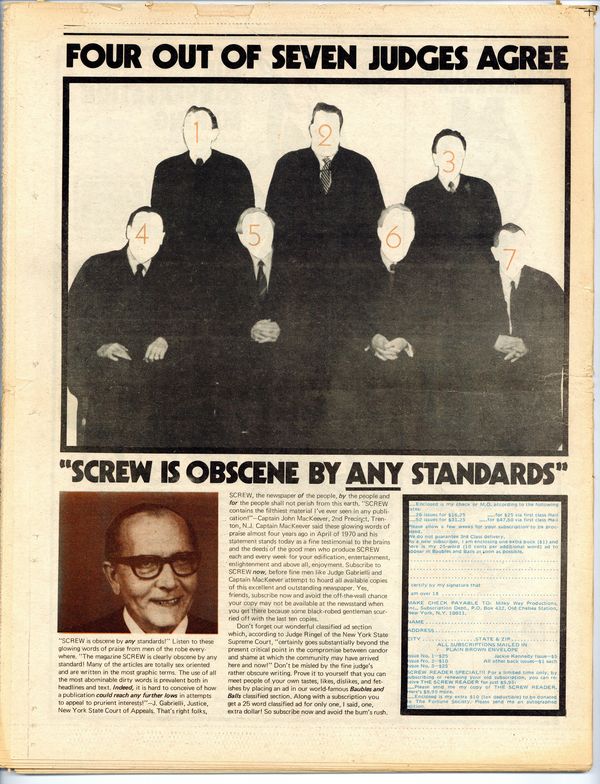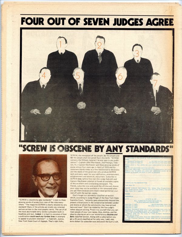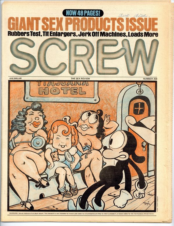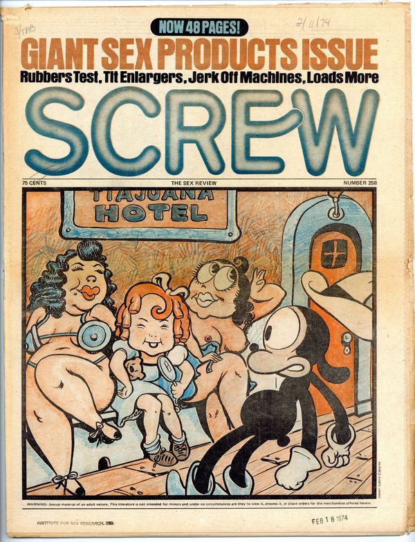 Published Feb 1974 by Milky Way Productions.$4.20Screw was a weekly tabloid newspaper published and edited by Al Goldstein and his Milky Way Productions. This New York based publication was notable for being a pioneer in bringing hardcore pornography into the American mainstream during the late 1960s and early 1970s. Cover by Leslie Cabarga. Tabloid format, 11.5" x 14.75", 48 pages, B&W. ADULT MATERIAL Cover price $1.00.