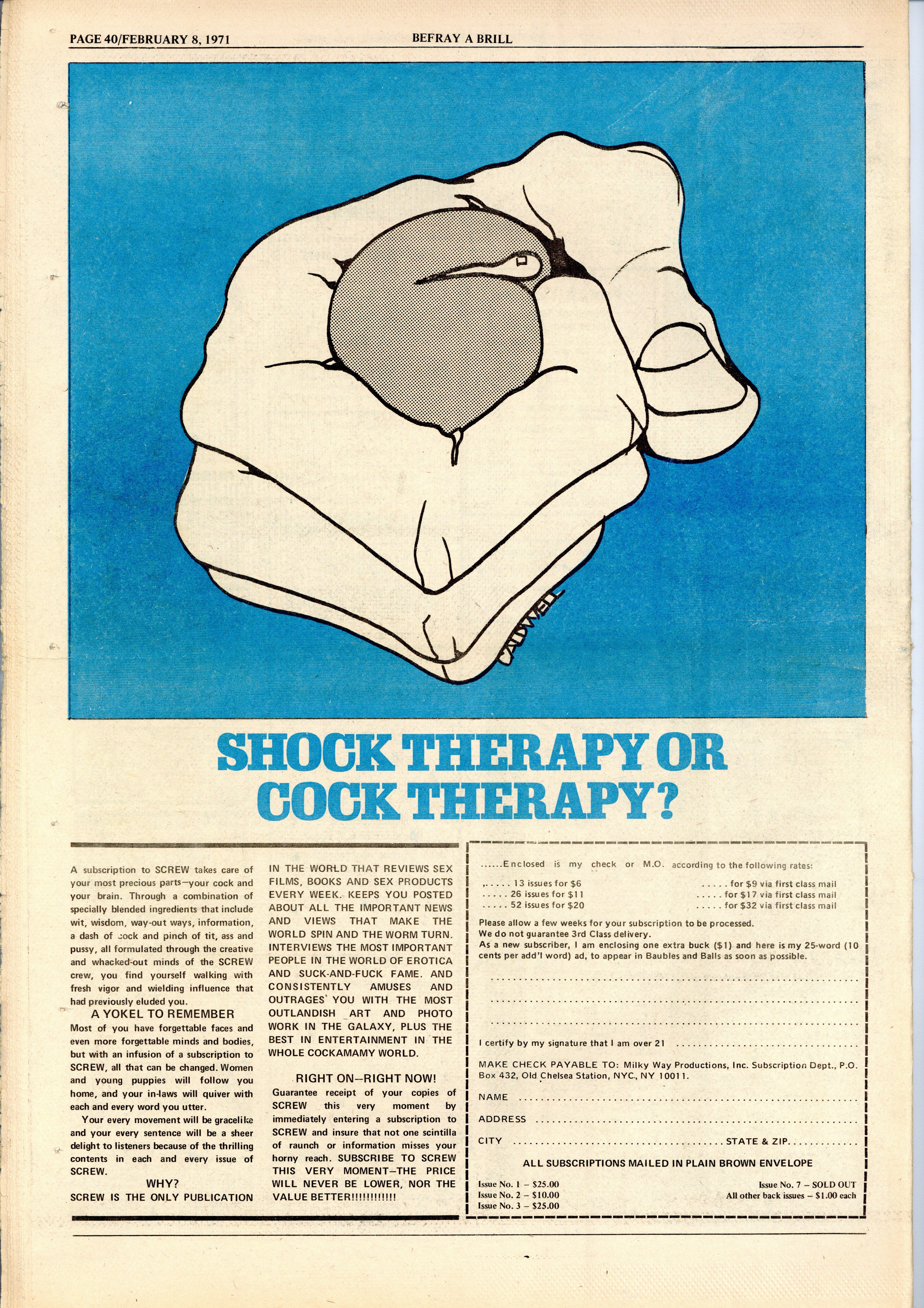 Published Feb 1971 by Milky Way Productions.$7.20Screw was a weekly tabloid newspaper published and edited by Al Goldstein and his Milky Way Productions. This New York based publication was notable for being a pioneer in bringing hardcore pornography into the American mainstream during the late 1960s and early 1970s. Tabloid format, 11.5" x 16.75", 40 pages, B&W. ADULT MATERIAL Cover price $0.50.