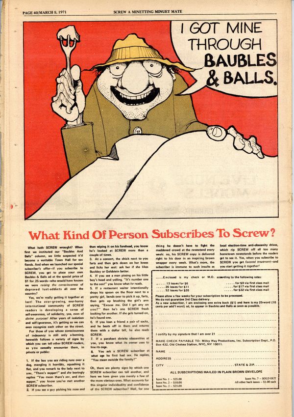 Published Mar 1971 by Milky Way Productions.$4.20Screw was a weekly tabloid newspaper published and edited by Al Goldstein and his Milky Way Productions. This New York based publication was notable for being a pioneer in bringing hardcore pornography into the American mainstream during the late 1960s and early 1970s. Tabloid format, 11.5" x 16.75", 40 pages, B&W. ADULT MATERIAL Cover price $0.75.
