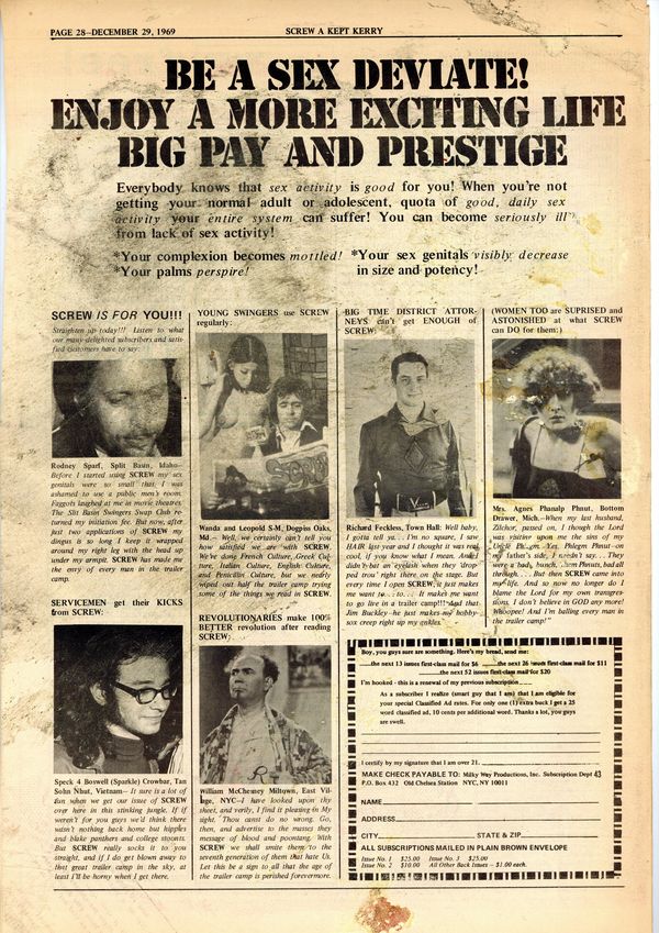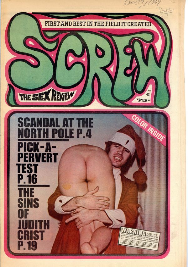 Published Dec 1969 by Milky Way Productions.$3.20Screw was a weekly tabloid newspaper published and edited by Al Goldstein and his Milky Way Productions. This New York based publication was notable for being a pioneer in bringing hardcore pornography into the American mainstream during the late 1960s and early 1970s. Tabloid format, 11.5" x 16.75", 28 pages, B&W. ADULT MATERIAL Cover price $0.75.