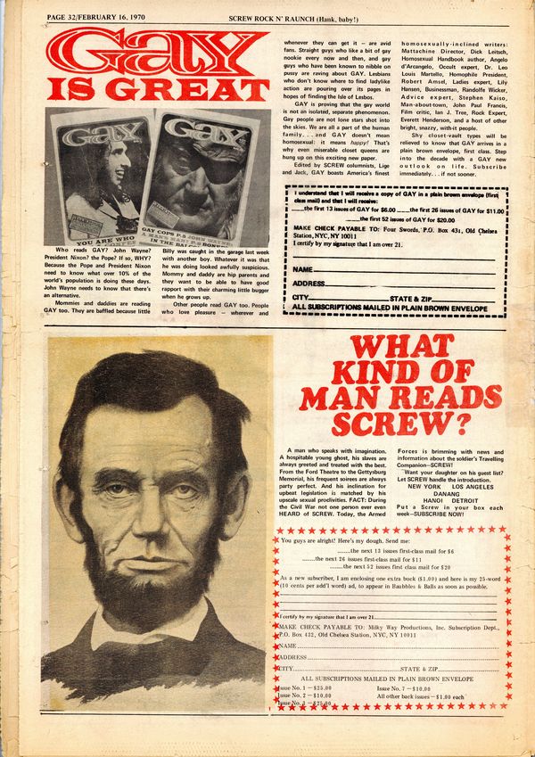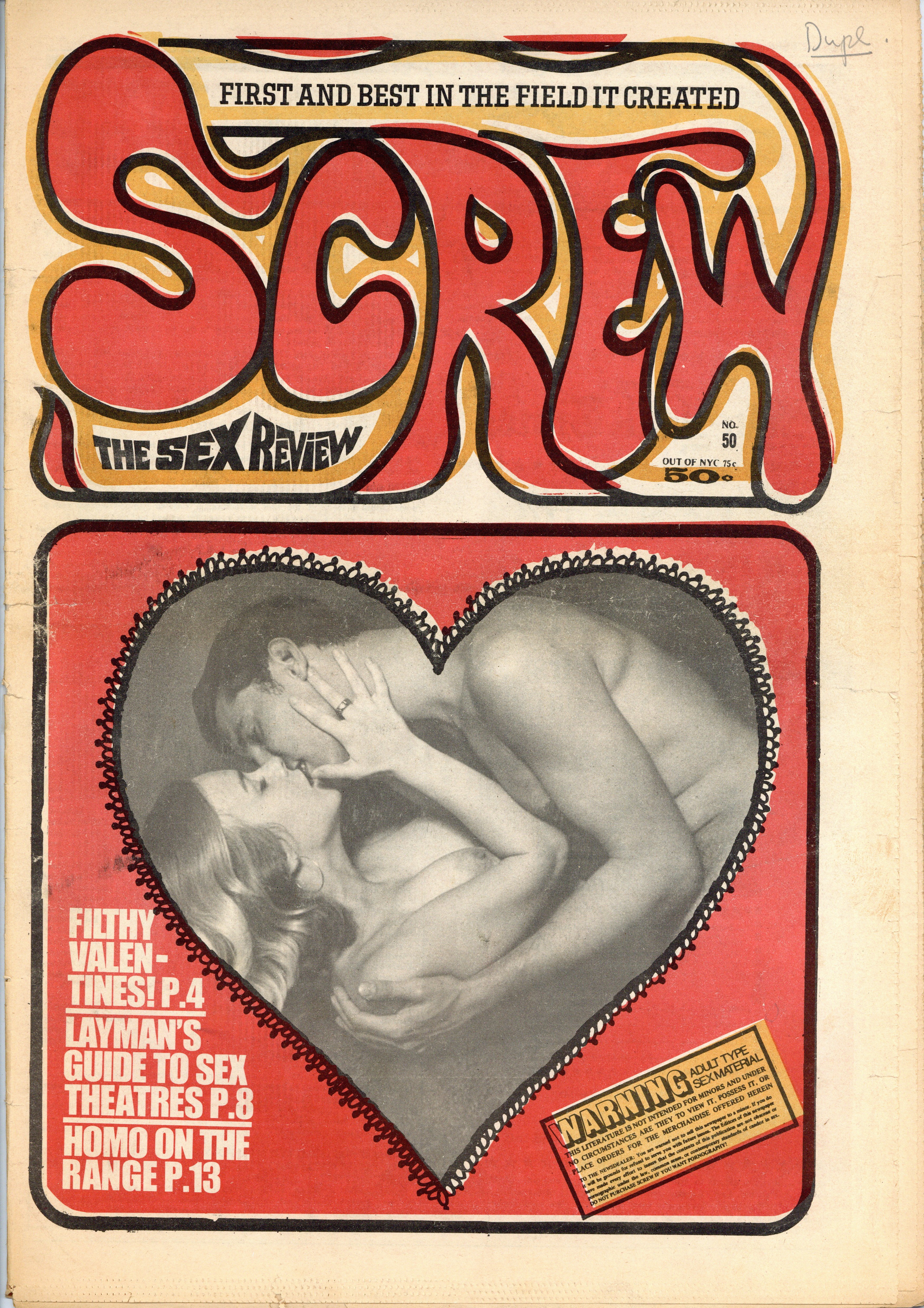 Published Feb 1970 by Milky Way Productions.$3.20Screw was a weekly tabloid newspaper published and edited by Al Goldstein and his Milky Way Productions. This New York based publication was notable for being a pioneer in bringing hardcore pornography into the American mainstream during the late 1960s and early 1970s. Tabloid format, 11.5" x 16.75", 32 pages, B&W. ADULT MATERIAL Cover price $0.50.