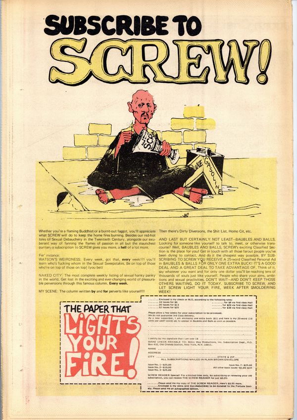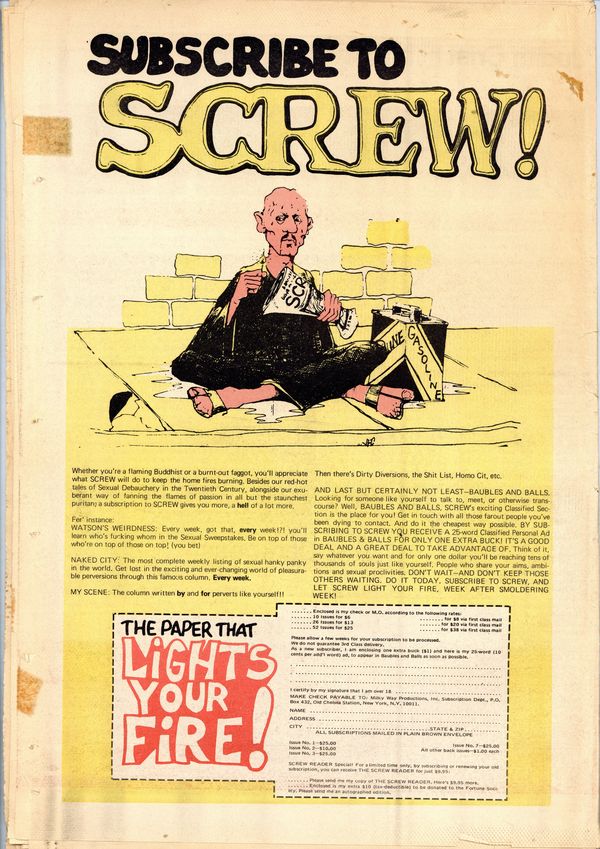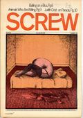 Published Dec 1971 by Milky Way Productions.$3.60Screw was a weekly tabloid newspaper published and edited by Al Goldstein and his Milky Way Productions. This New York based publication was notable for being a pioneer in bringing hardcore pornography into the American mainstream during the late 1960s and early 1970s. Cover by Philippe Weisbecker. Tabloid format, 11.5" x 16.75", 36 pages, B&W. ADULT MATERIAL Cover price $0.50.