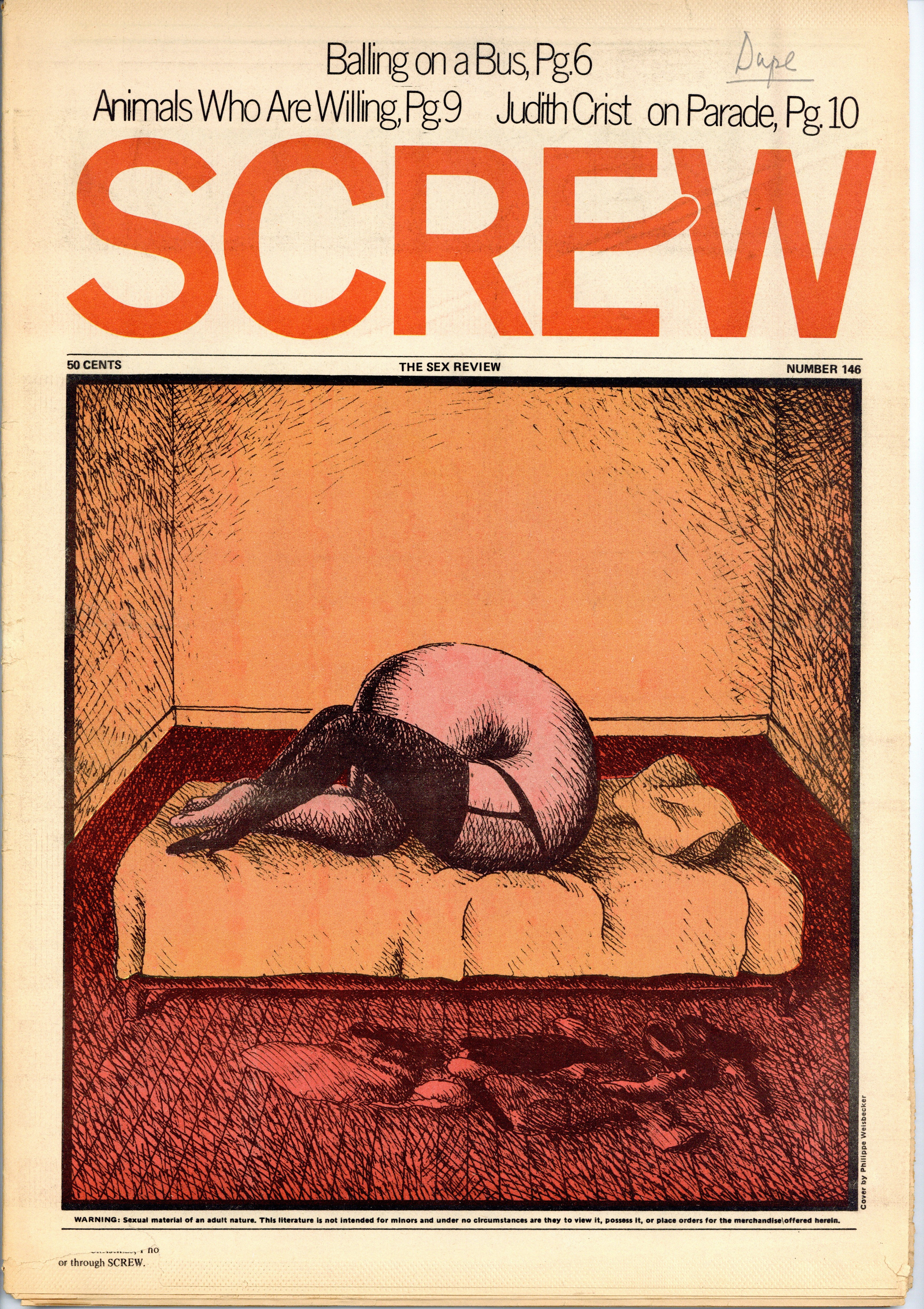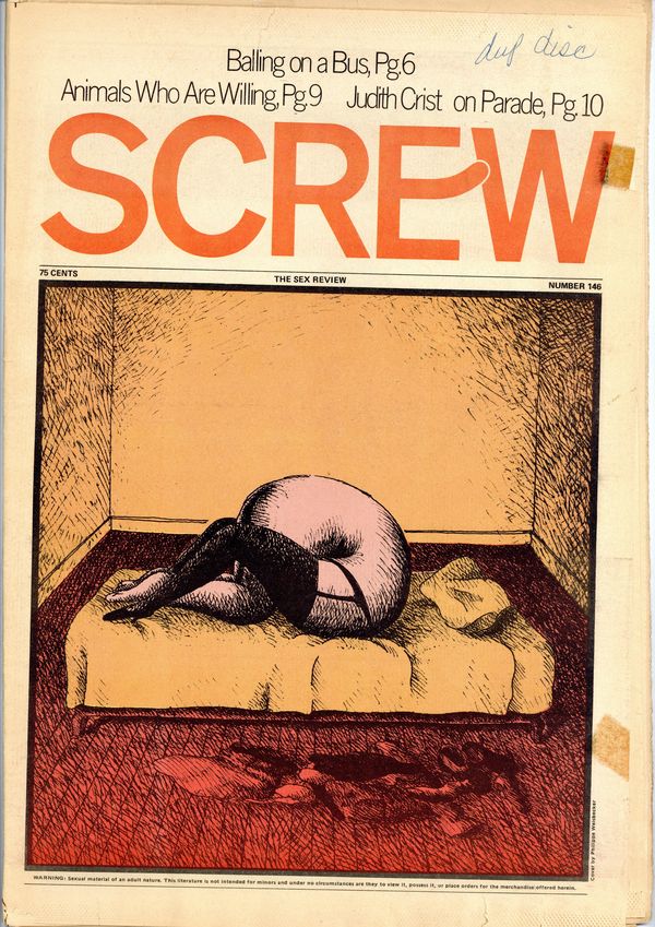 Published Dec 1971 by Milky Way Productions.$2.65Screw was a weekly tabloid newspaper published and edited by Al Goldstein and his Milky Way Productions. This New York based publication was notable for being a pioneer in bringing hardcore pornography into the American mainstream during the late 1960s and early 1970s. Cover by Philippe Weisbecker. Tabloid format, 11.5" x 16.75", 36 pages, B&W. ADULT MATERIAL Cover price $0.50.