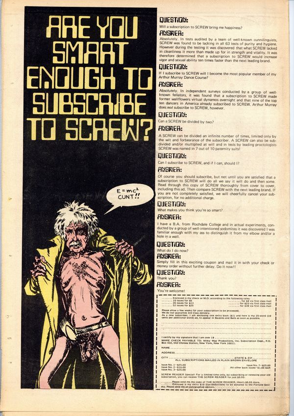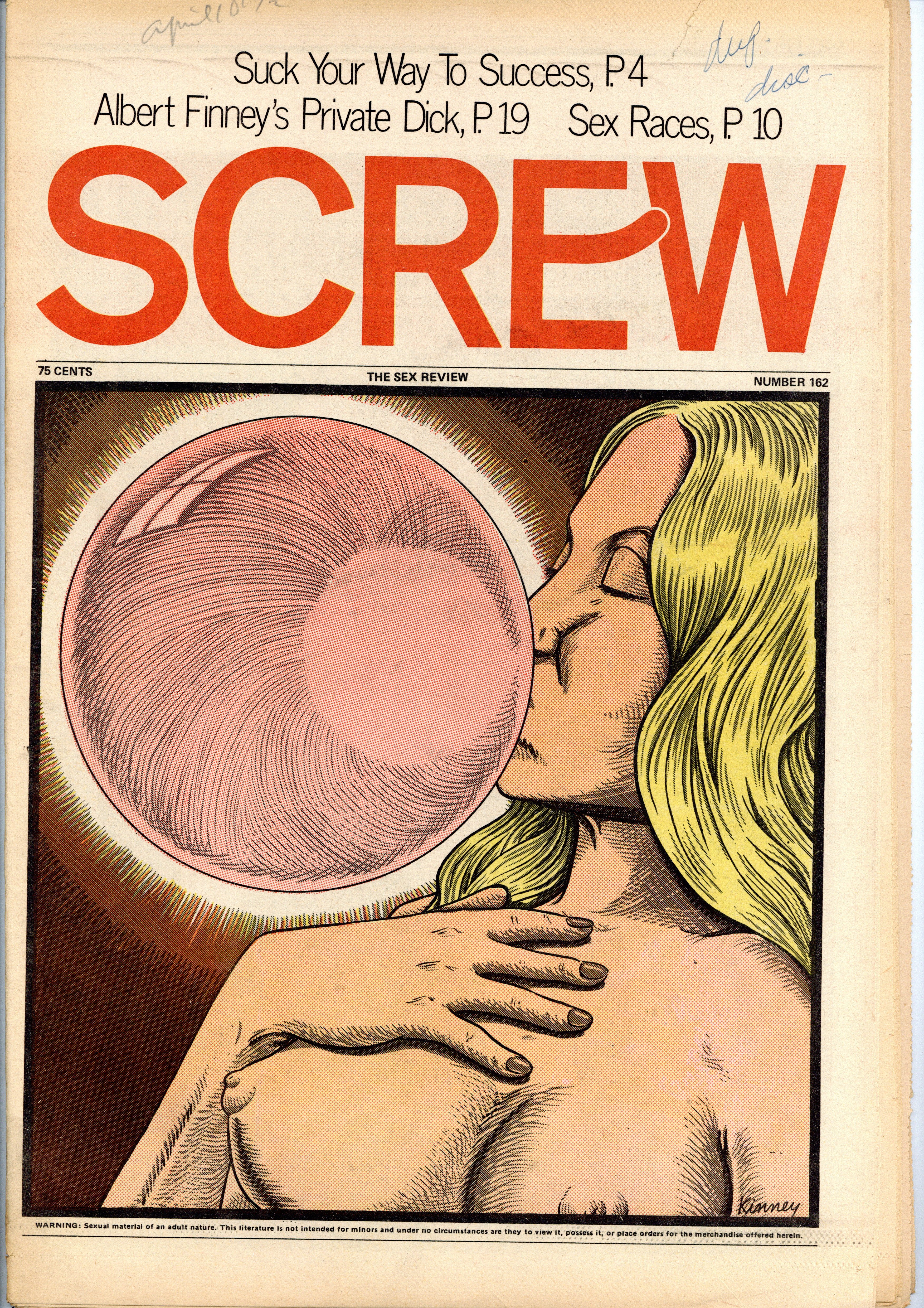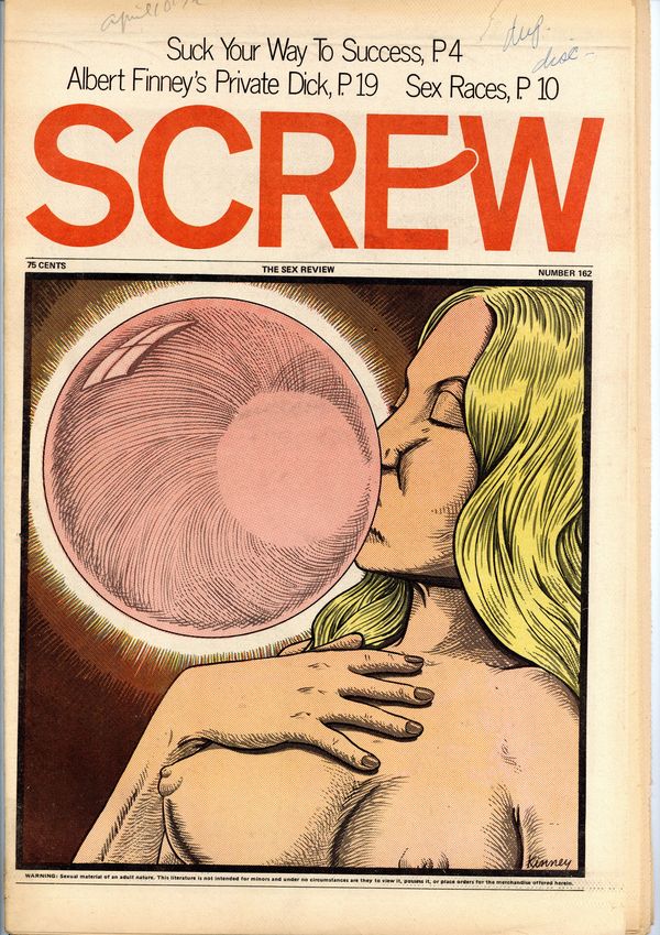 Published Apr 1972 by Milky Way Productions.$9.00Screw was a weekly tabloid newspaper published and edited by Al Goldstein and his Milky Way Productions. This New York based publication was notable for being a pioneer in bringing hardcore pornography into the American mainstream during the late 1960s and early 1970s. Cover by Jay Kinney. Tabloid format, 11.5" x 16.75", 36 pages, B&W. ADULT MATERIAL Cover price $0.75.