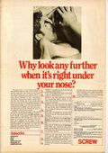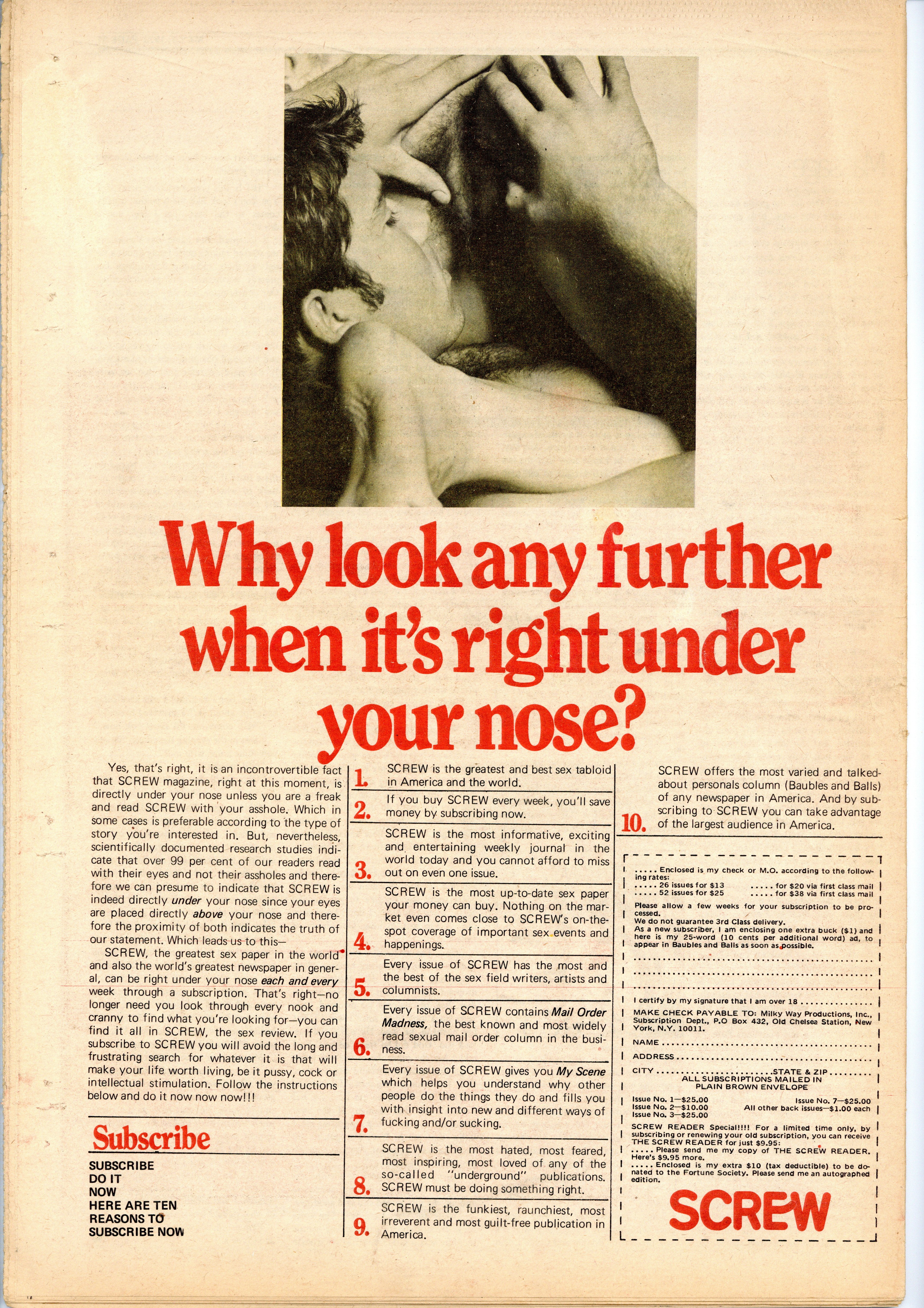 Screw was a weekly tabloid newspaper published and edited by Al Goldstein and his Milky Way Productions. This New York based publication was notable for being a pioneer in bringing hardcore pornography into the American mainstream during the late 1960s and early 1970s. Cover by Emmett McConnell. Tabloid format, 11.5" x 16.75", 32 pages, B&W. ADULT MATERIAL Cover price $0.75.