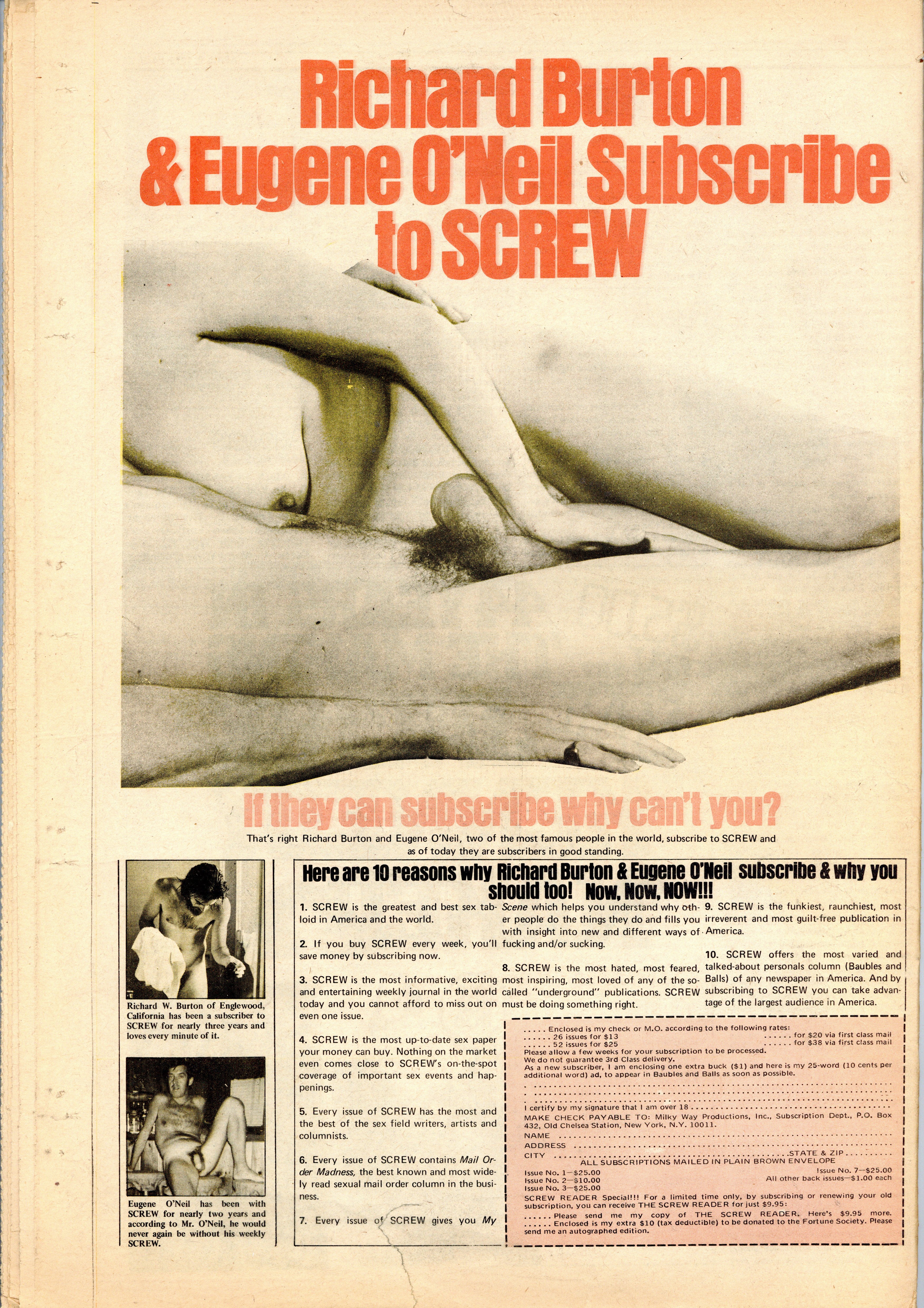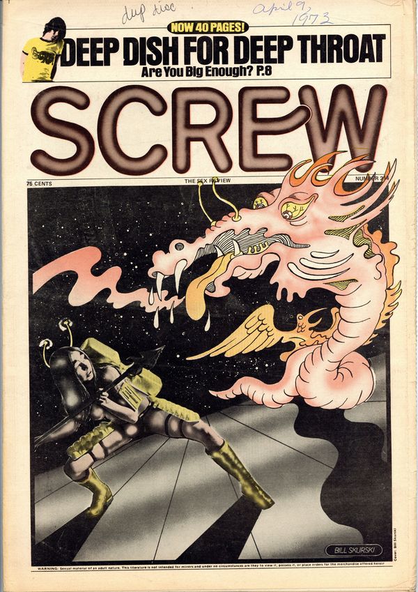 Published Apr 1973 by Milky Way Productions.$9.90Screw was a weekly tabloid newspaper published and edited by Al Goldstein and his Milky Way Productions. This New York based publication was notable for being a pioneer in bringing hardcore pornography into the American mainstream during the late 1960s and early 1970s. Cover by Bill Skurski. Tabloid format, 11.5" x 16.75", 40 pages, B&W. ADULT MATERIAL Cover price $0.75.