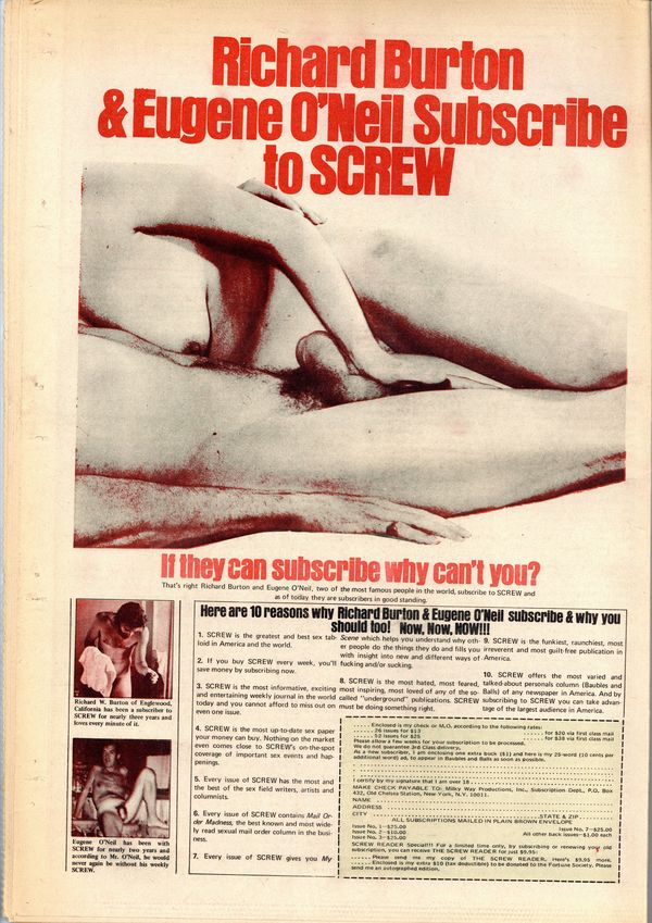 Published Apr 1973 by Milky Way Productions.$4.20Screw was a weekly tabloid newspaper published and edited by Al Goldstein and his Milky Way Productions. This New York based publication was notable for being a pioneer in bringing hardcore pornography into the American mainstream during the late 1960s and early 1970s. Cover by Martin Avillez. Tabloid format, 11.5" x 16.75", 40 pages, B&W. ADULT MATERIAL Cover price $0.75.