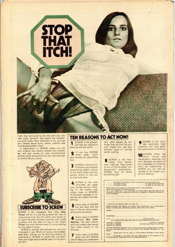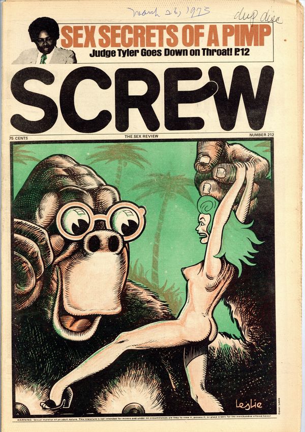 Published Mar 1973 by Milky Way Productions.$7.20Screw was a weekly tabloid newspaper published and edited by Al Goldstein and his Milky Way Productions. This New York based publication was notable for being a pioneer in bringing hardcore pornography into the American mainstream during the late 1960s and early 1970s. Cover by Leslie. Tabloid format, 11.5" x 16.75", 40 pages, B&W. ADULT MATERIAL Cover price $0.75.