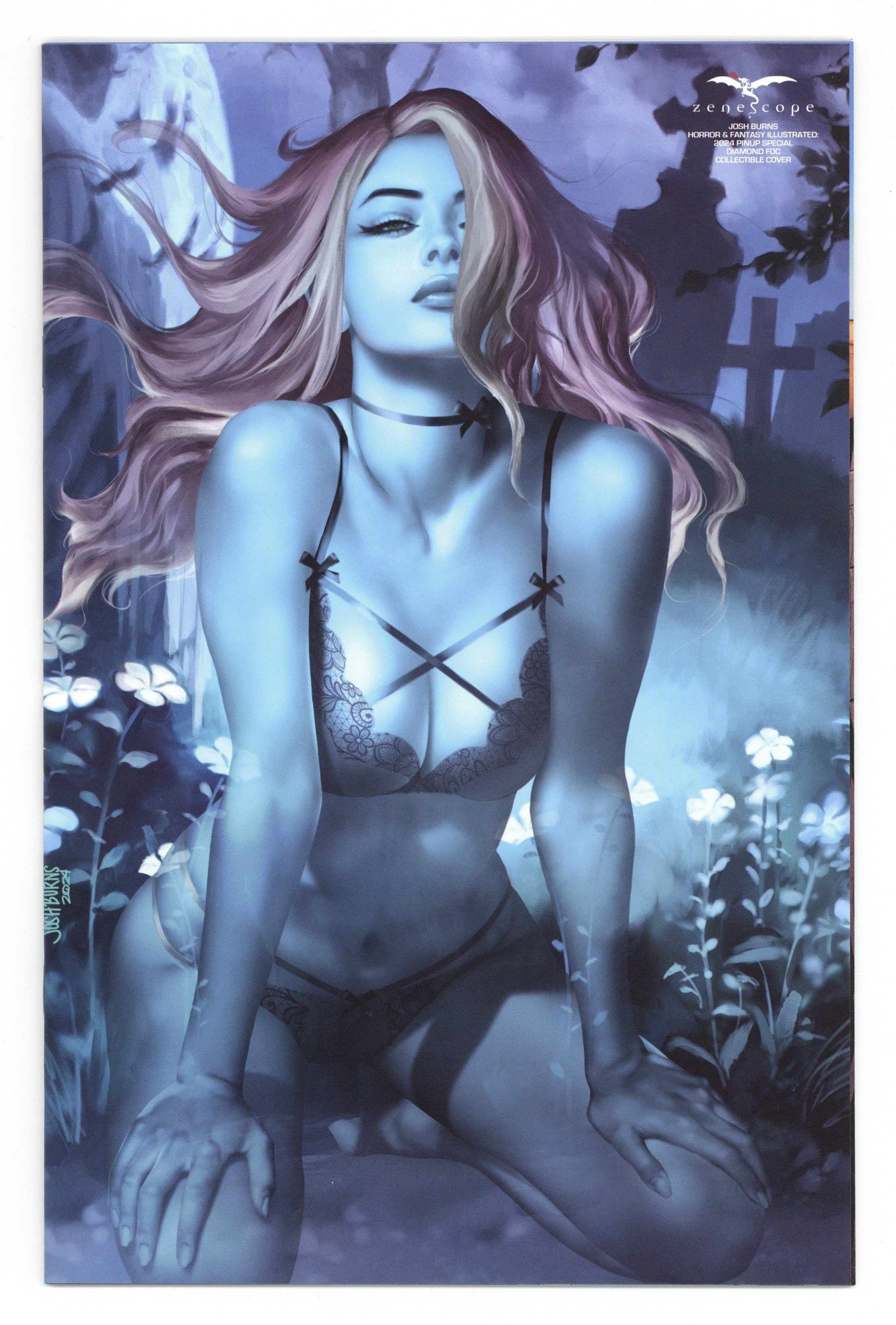 Published Oct 2024 by Zenescope Entertainment.$26.00Limited 1 for 20 Retailer Incentive Variant Cover. Written by Noah Mitchell. Cover by Josh Burns. Just in time for the Halloween season, comes the first ever Horror & Fantasy Illustrated Pinup Special! Get ready to check out all of these new spooky heroines and villainesses, donning original sexy costumes, along with some newly-imagined cosplays of pop culture's most famous monsters! Some of the industry's top artists contribute gorgeous pin-ups in this stunning collection. Also includes a never before published short story! 40 pages, full color. Rated T Cover price $10.00.