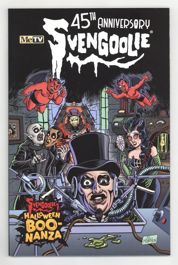 $26.00Written by Rich Koz & Various. Art by Bill Morrison & Various. Cover by Bill Morrison. TV Horror host Svengoolie celebrates his 45th on-air anniversary and Halloween in scary style with a series of a stories written by Sven and all the members of the Sven Squad. Sven and a new set of ghoulish heroes confront 'The Day of the Doorbell Demons' while Nostalgiaferatoo, Gwengoolie, and IMP each appear in their own solo story. Also not to be missed, Comic Sven interludes by the legendary Sergio Aragones. This is a must read for the Halloween Season! 48 pages, full color. Cover price $7.99.